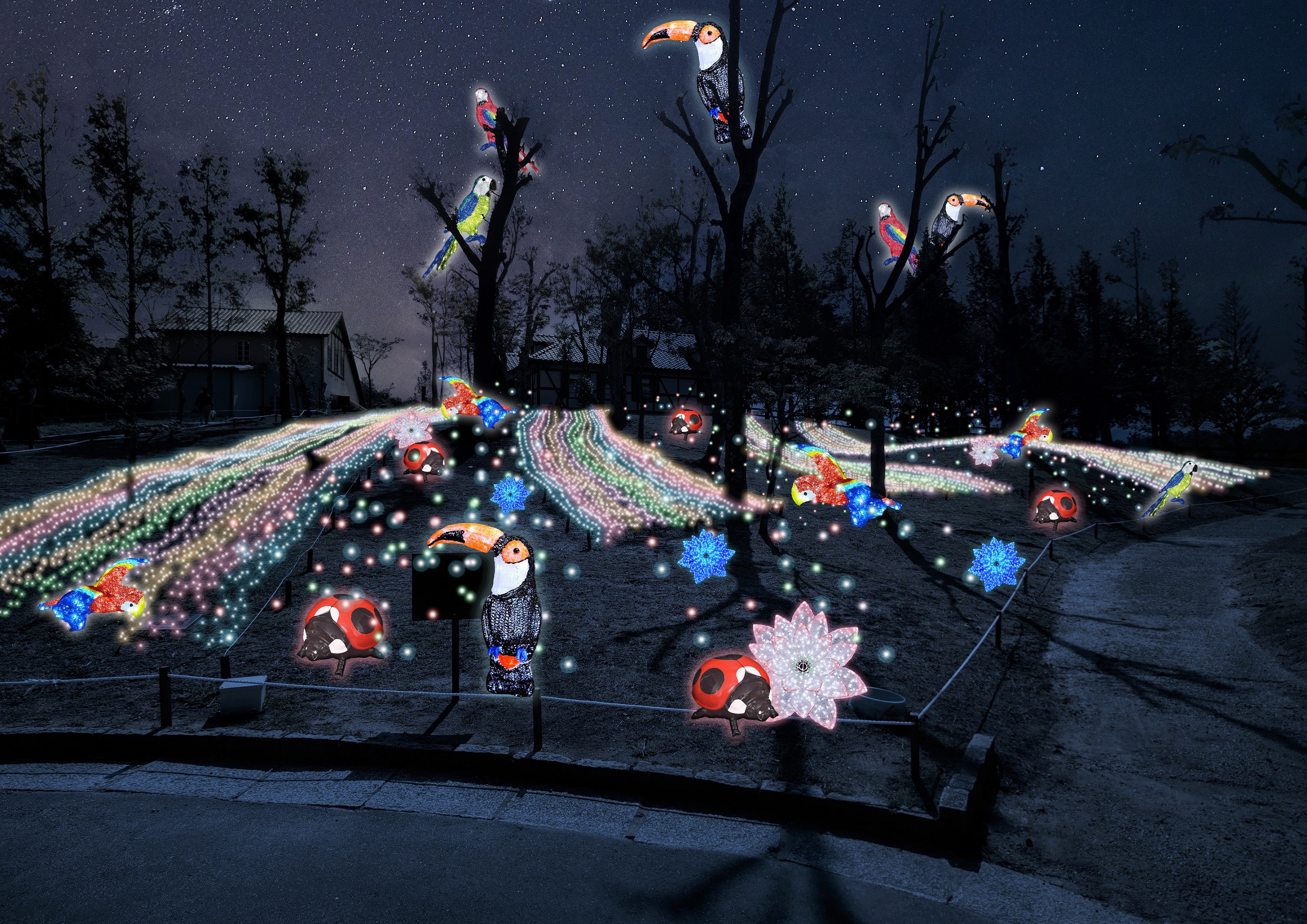 「煌めく虫たちのエントランス」では、色とりどりのイルミネーションの中に生息するカブトムシやカマキリなど巨大な「ロボット昆虫」がお出迎え。光り輝くメタセコイアの街路樹に囲まれた「輝きのプレイ広場」は、光るブランコやシーソーのほか、鍵盤や円形のライトを踏むと色が変わったり、音が鳴る仕掛けなど光と音のコラボレーションをお楽しみいただけます。イルミネーションで覆われた70メートルの「光の道」は、写真スポットにお薦めです。大人からお子様まで、園内を散策しながら幻想的なイルミネーションをお楽しみいただけます。