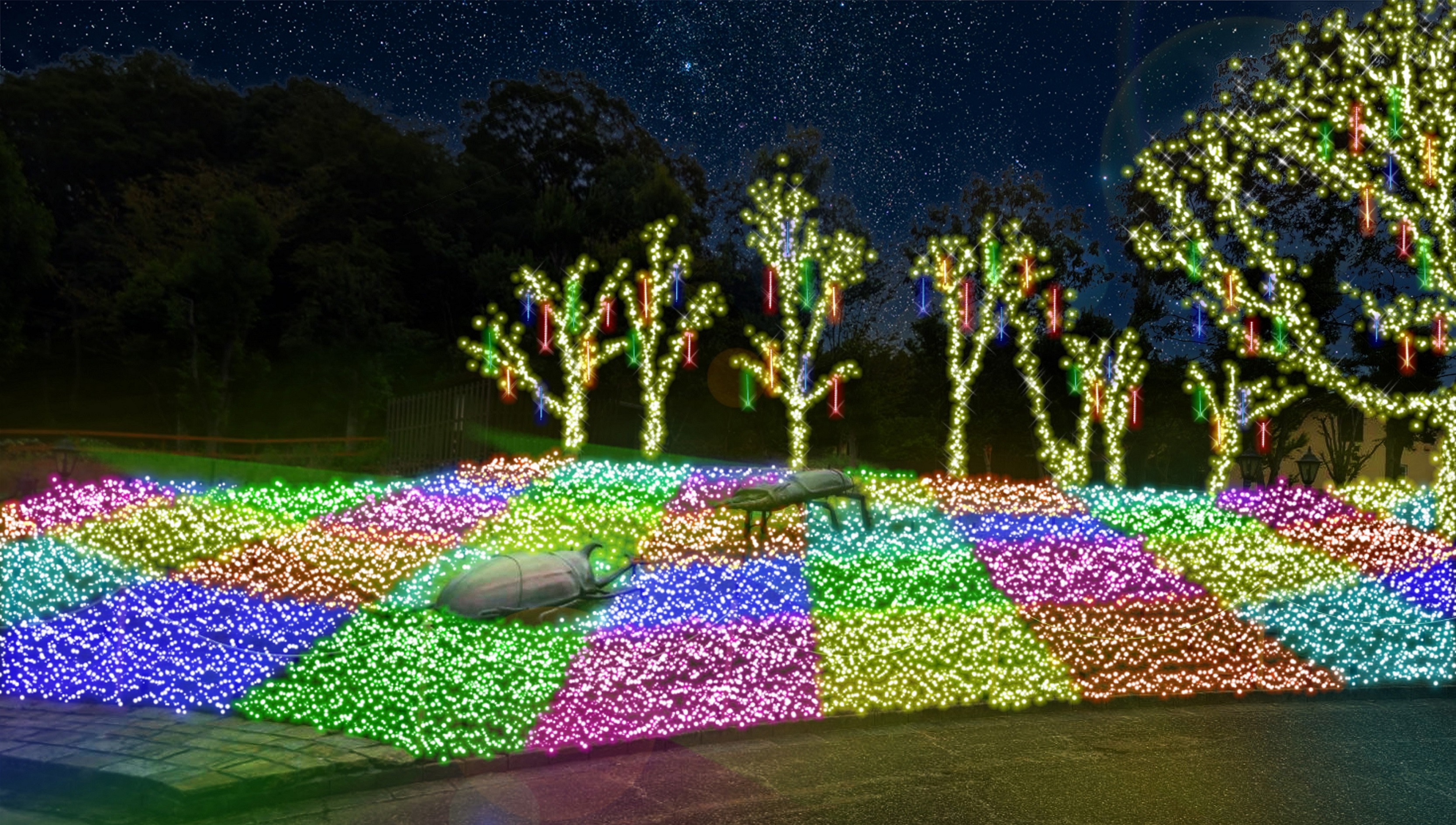 色とりどりに光るイルミネーションの林に、カブトムシやカマキリなど巨大な「ロボット昆虫」が生息しています。