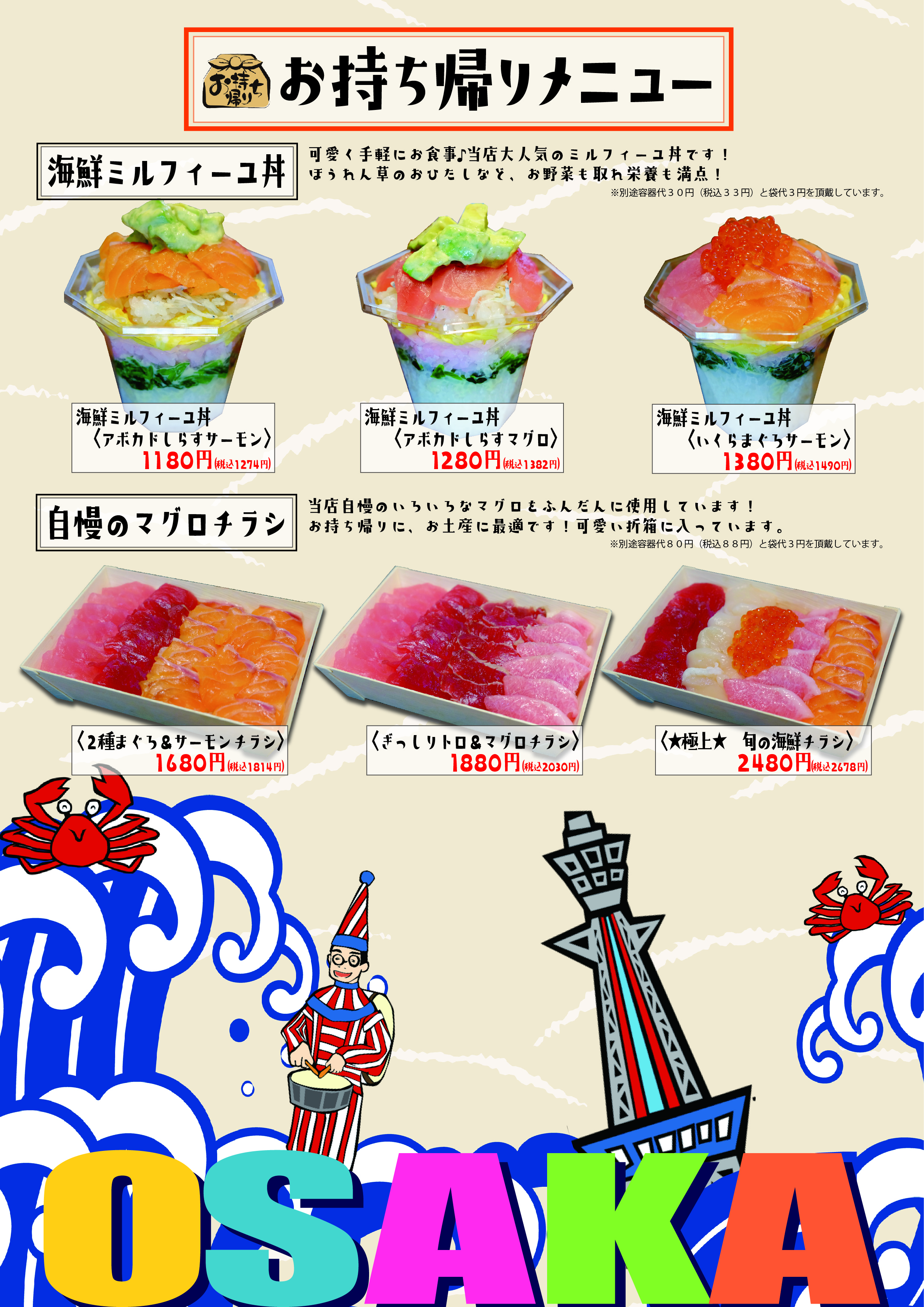 また、お持ち帰り専用メニューでは、【海鮮ミルフィーユ丼(税込1,180円~)】といった野菜と海鮮を挟んだ可愛い彩のある丼をご提供いたします。是非、お土産にも活用いただきたいメニューです。