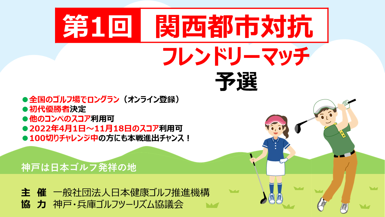 健康ゴルフを提唱する一般社団法人日本健康ゴルフ推進機構(以下、当機構)(会長 小森剛)は、 神戸・兵庫ゴルフツーリズム協議会(一般財団法人神戸観光局内)の協力のもと、初となる関西都市対抗フレンドリーマッチ(以下、本大会)を、開催します。