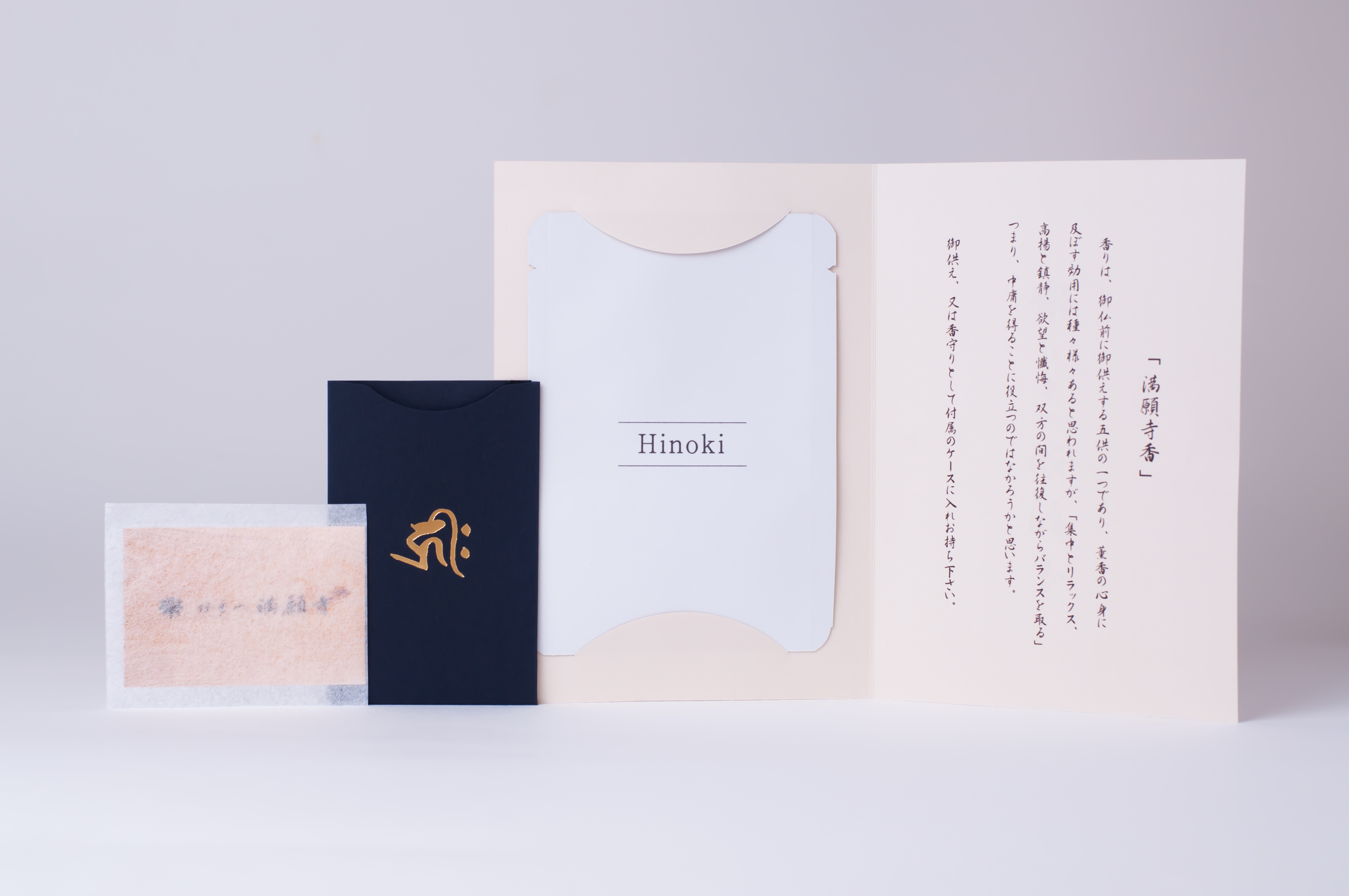 香りは、日本人に馴染みのある香りを用いることで安心感が増すのではないかと「国産ヒノキの粉末アロマ」と白檀などの「お香」とを調合しました。これにより”香りが揮発する”アロマのデメリットを”香りの持続する”お香が補い、移ろい行く香りを楽しむことが出来るのも特徴のひとつとなりました。