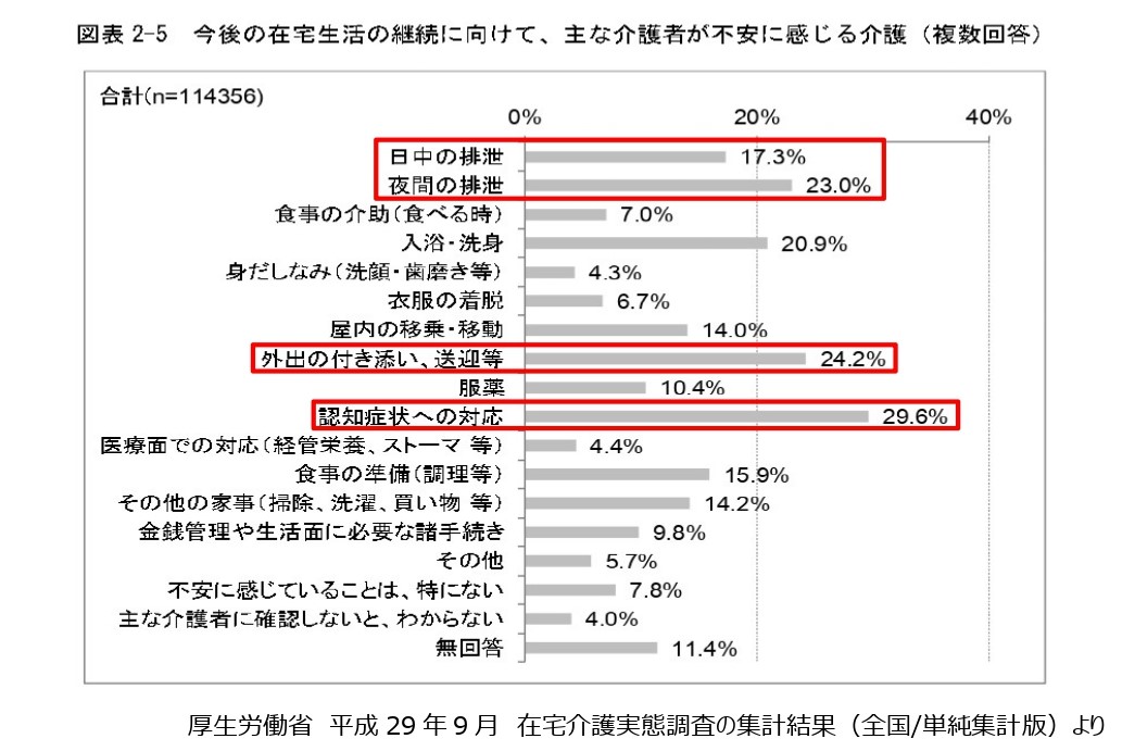近年増える在宅介護の悩み。平成29年9月に厚生労働省が在宅介護実態調査を実施した中で、主な「介護者が不安に感じる介護」の全国集計では「日中・夜間の排泄」は3番目に多い結果となっています。