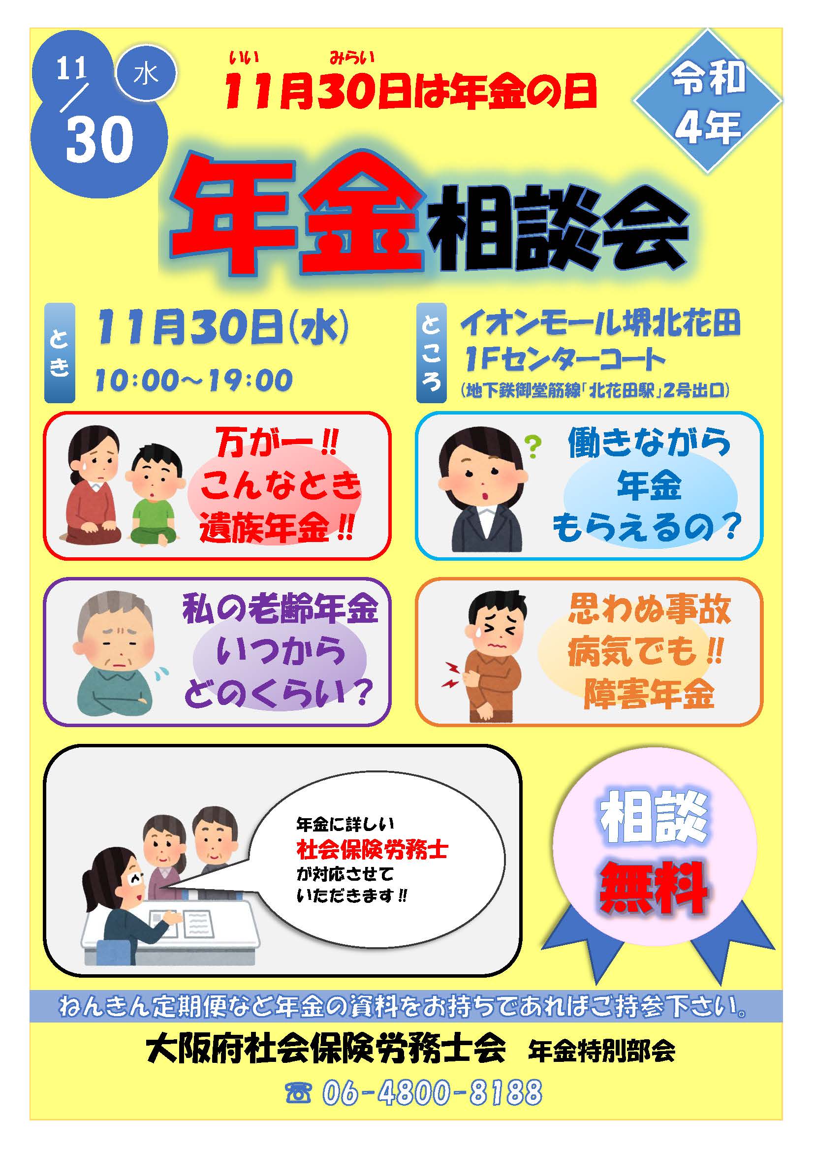 令和4年11月30日にイオンモール堺北花田店1F「センターコート」にて「無料年金相談会」を開催します。