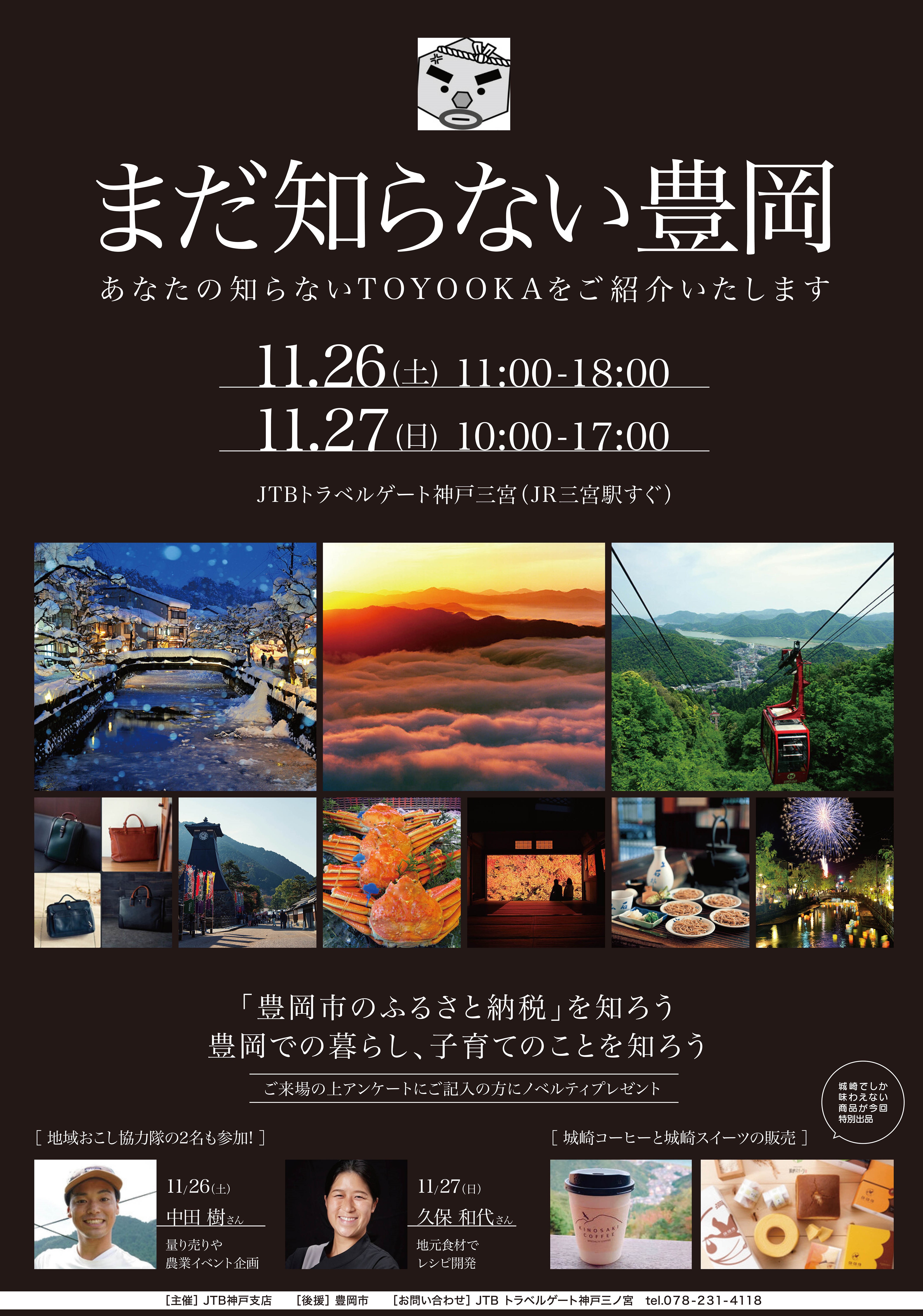 さらに豊岡市の職員も参加し、ふるさと納税の制度や豊岡鞄をはじめとする人気の返礼品などについても詳しくご案内いたします。店舗1階では城崎コーヒーや、城崎スイーツも販売。豊岡の魅力を存分に感じていただけるイベントとなっております。