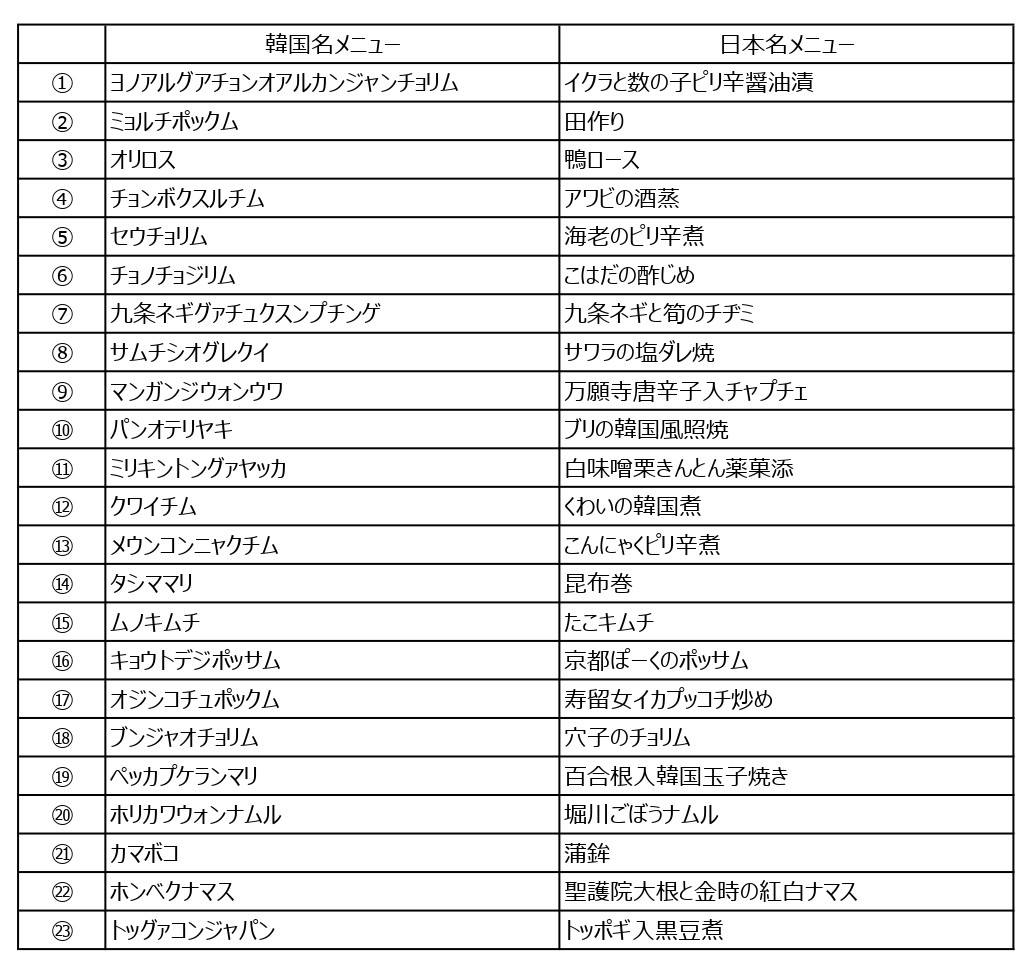 韓国名メニュー ( 日本名メニュー )