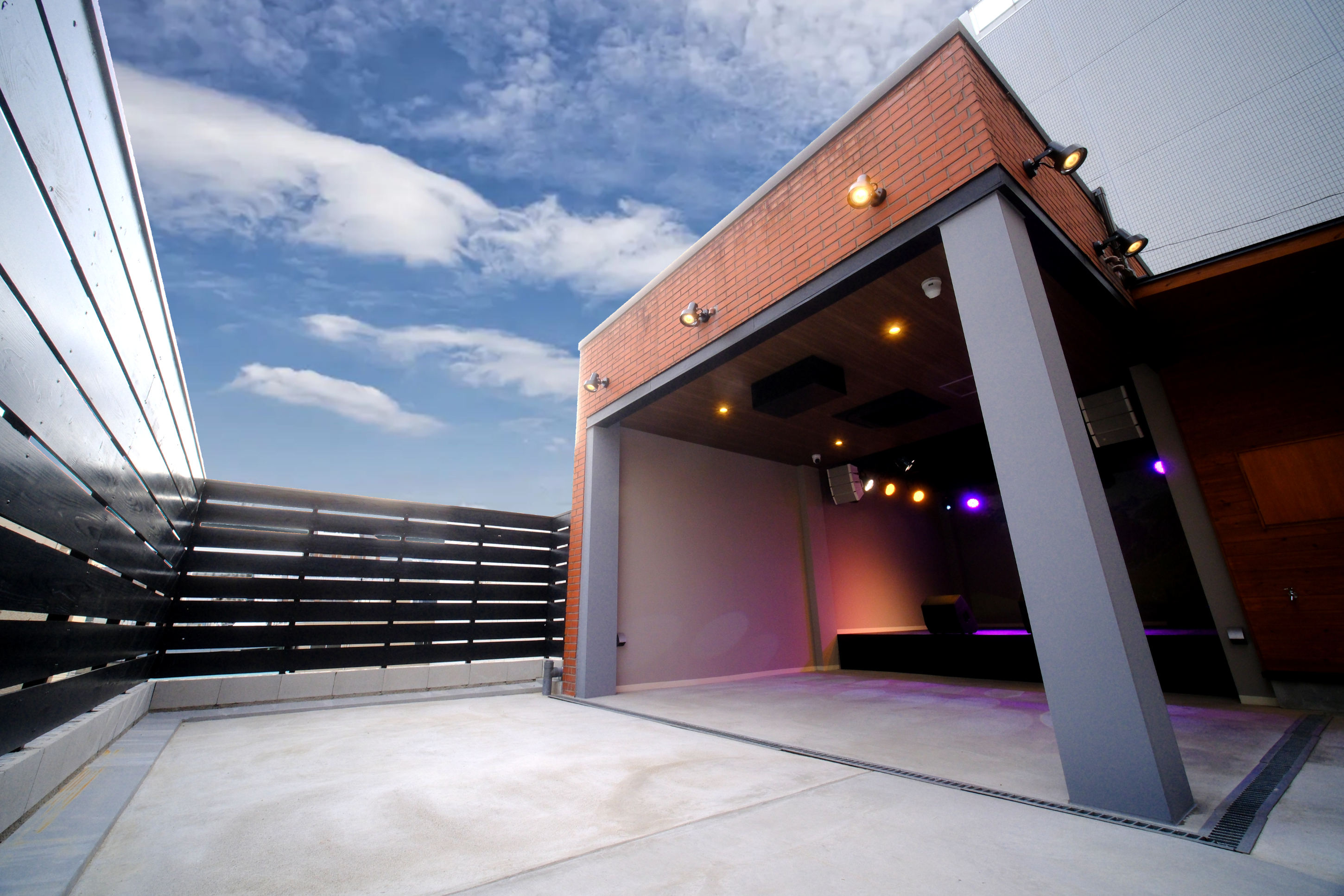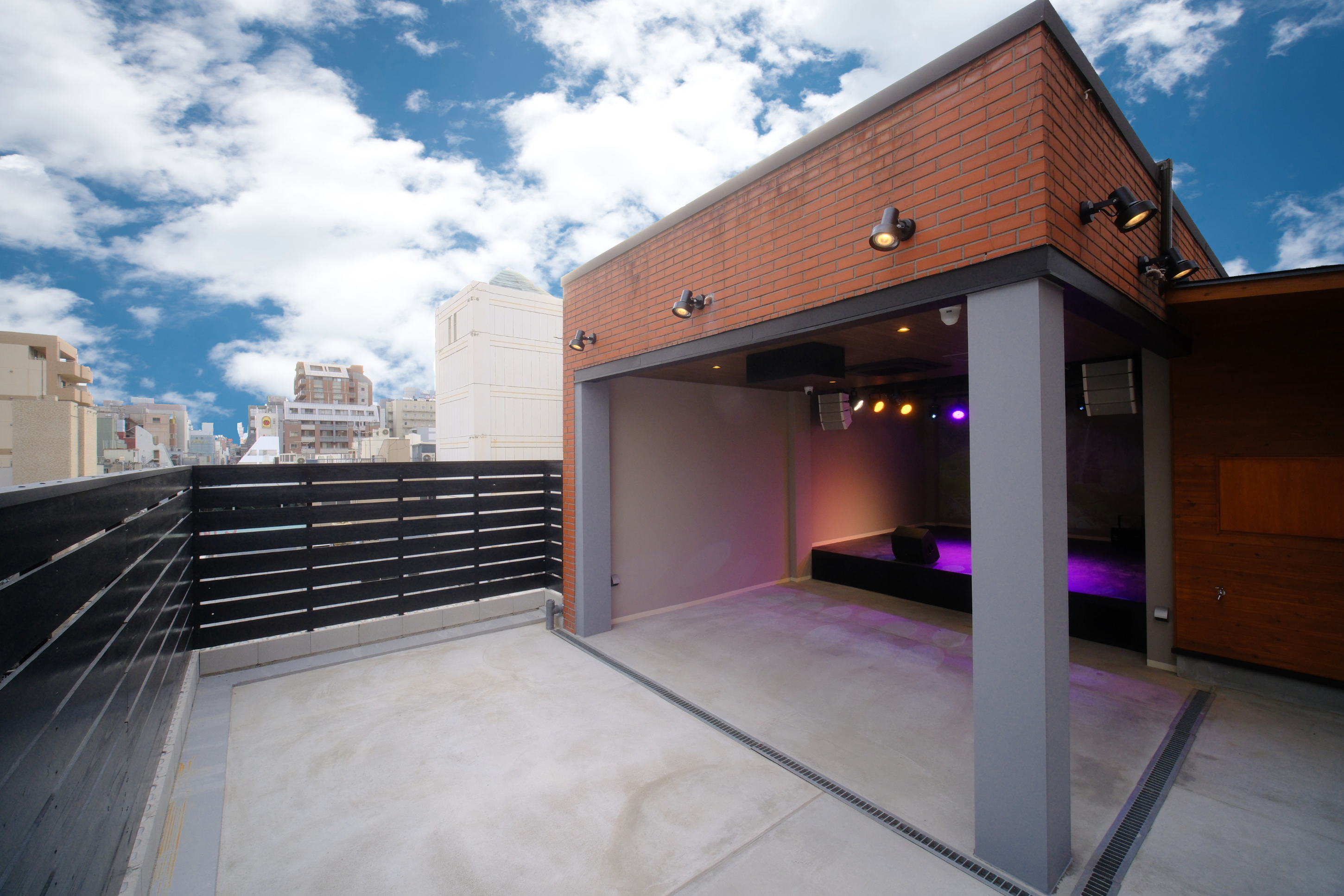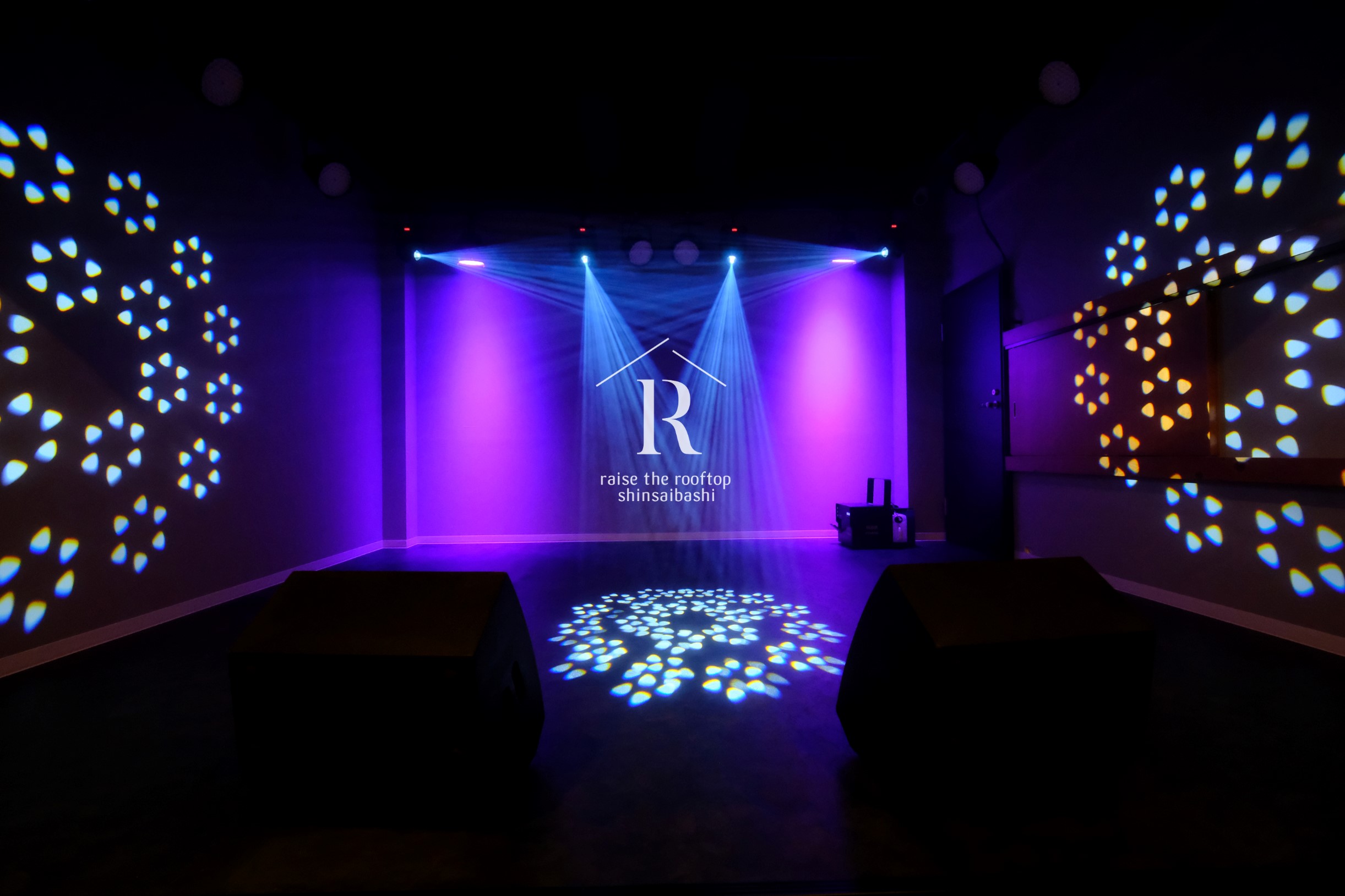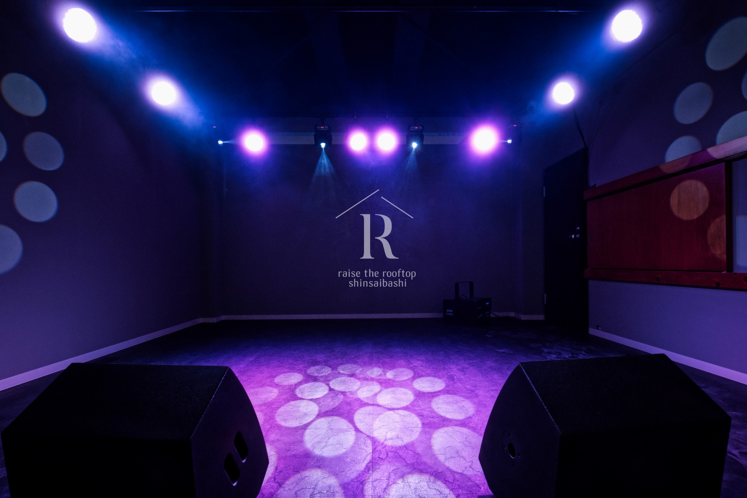 ステージ(約17平方メートル)にコンセントやウーハーを埋め込み、ダンスの振り付けなどがあるアーティストのことも考えてできる限りステージ上に配線などは出ないようスッキリとさせています。 当エリアの音量制限で80デシベル(鉄道の線路脇、飛行機の機内)以上の大きさを出すことはできませんが、スピーカーの位置や大きさを工夫することで観客だけにしっかり音が届くよう調整しています。話し声が聞こえるくらいの音量でも良い音質の音楽が楽しめます。 スモーク演出も火災と勘違いされないよう、放出してしばらくすると消えるようにするなど煙の成分や分量には細心の注意を払いました。 プロジェクターを設置しているので、デジタルアーティストによる即興ドローイング会場や、PV(パブリックビュー)会場としてもご利用いただけます。 「心斎橋Raise the rooftop」の由来は、「屋根をブチ上げるほどに盛り上がろう!/羽目を外して騒ごう!」という意味のスラングを元にし、メインビジュアルはRが屋根を大きく持ち上げるように大きくなっています。