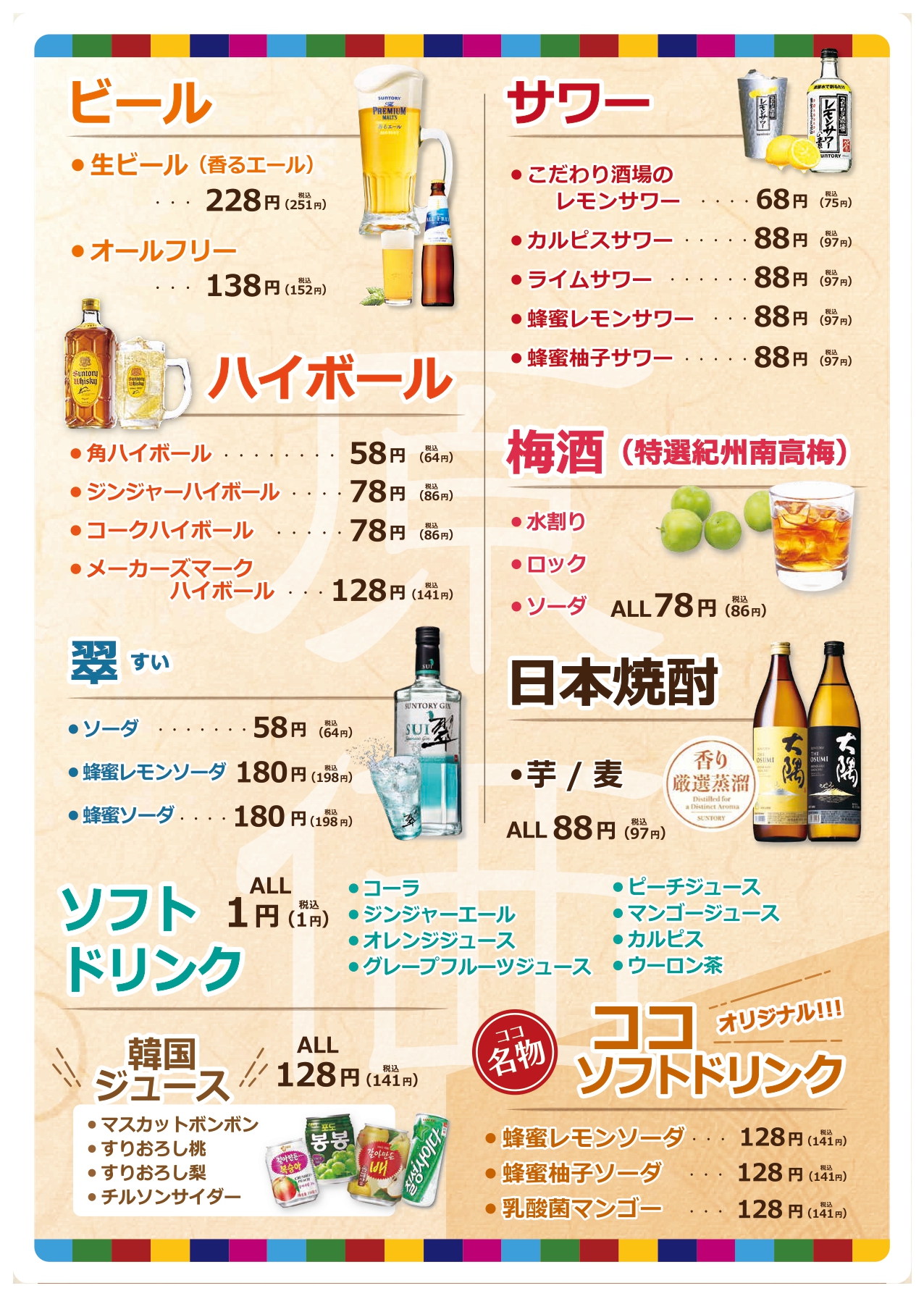 ・日本焼酎(芋・麦) 各97円 ・角ハイボール 64円