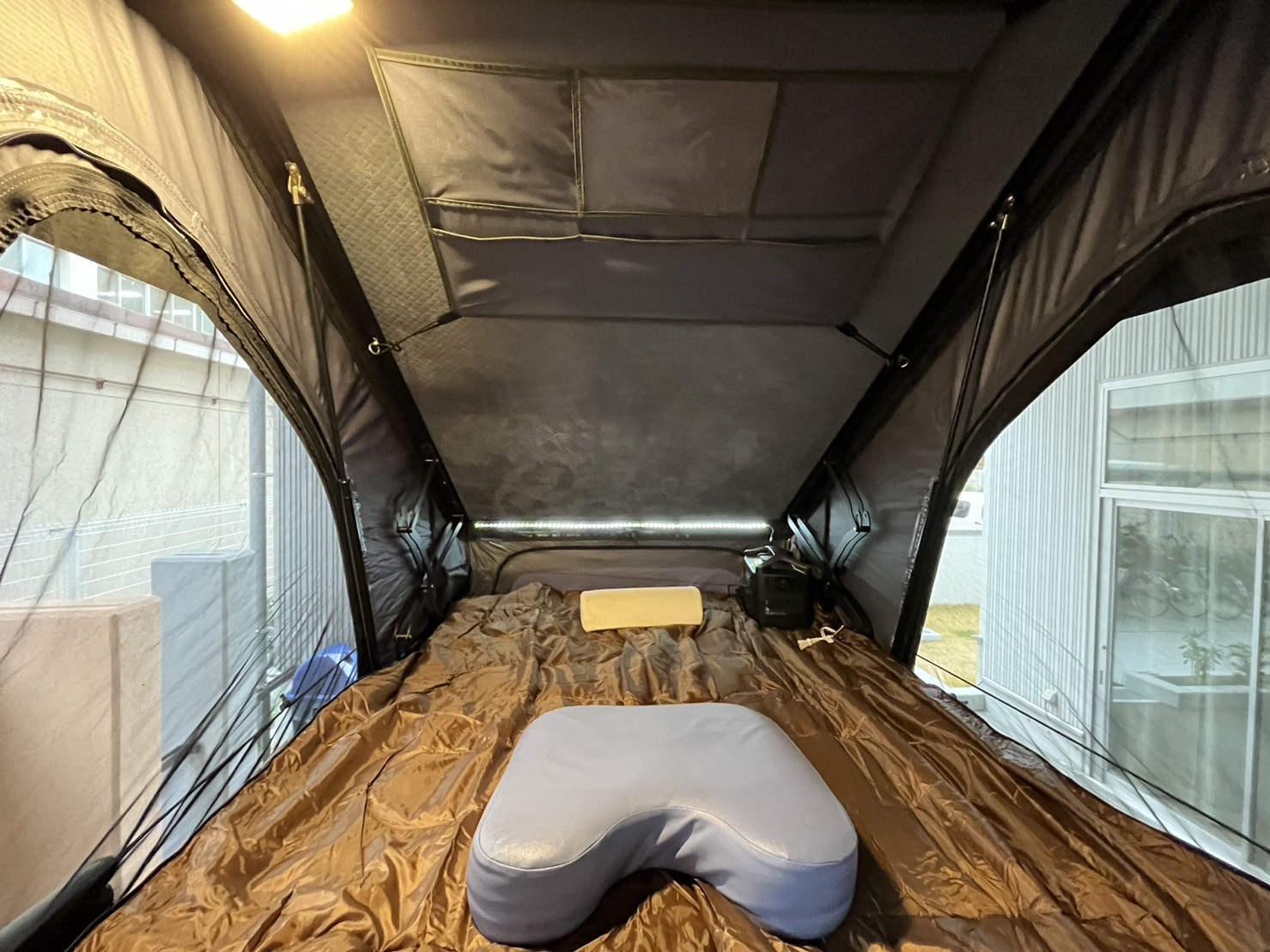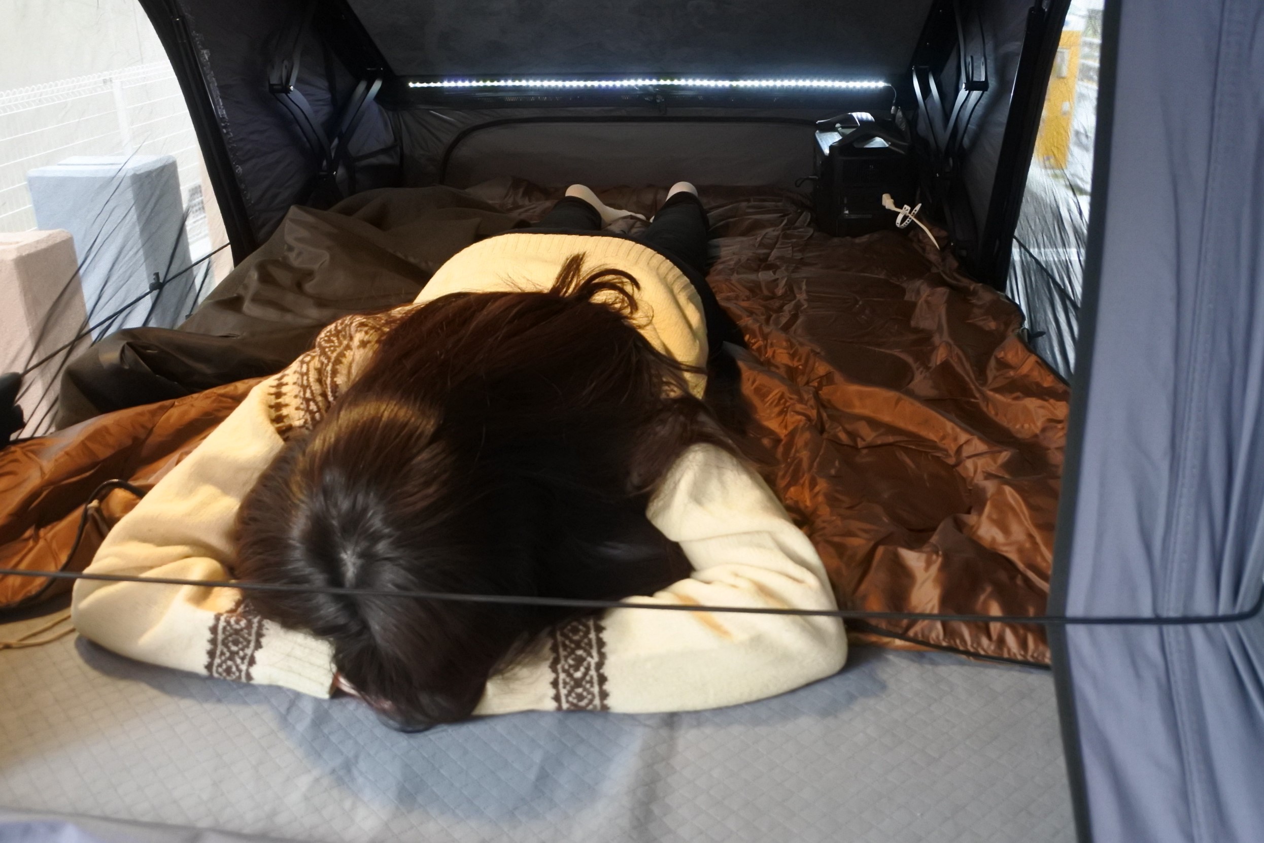 テント入り口は130cmあるので入りやすく、施術スペースは120cm×200cmとゆったりとしたスペースを確保。テント内にはライトを設置し、季節によっては電気毛布を敷けます。そばで待機されると落ち着かない方もおられますので、施術者は鍼や灸を設置したあとは運転席で待機し、定期的に声掛けや目視で異変がないかを確認します。車に連結する形でテントを張ることができ、テントの中にベッドを設置して施術を受けていただくこともできます。