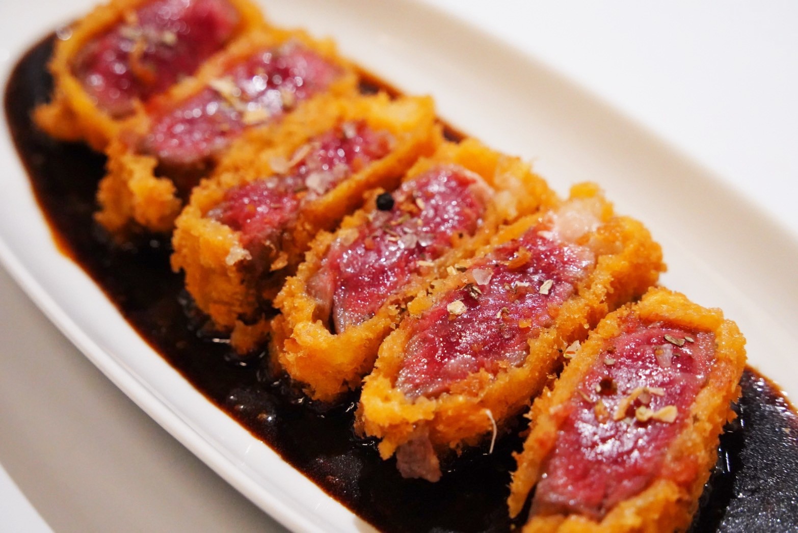 天王寺店限定メニューとして「黒毛和牛のレアカツ」(1,408円)をご用意。黒毛和牛の経産牛(仔牛を生んだことのあるメス牛)をたっぷり150グラム使い、中はレアな状態で仕上げています。経産牛ならではの、深い味わいと柔らかな食感をお楽しみいただけます。「Bistroフレンチマン」の名物料理をアレンジした「うにとイクラの冷製パスタ」(2,178円)をはじめ、ホールチーズにパスタをからめて仕上げる「ホールチーズのクリームパスタ」(770円~)、バターを効かせた「ひとくち焼きウニぎり」(385円)など30種類以上そろえています。食材によって異なるソースをかけて提供する「串焼き」(8種類、1本275円~)、ショーケースに日替わりで並ぶ「小皿料理」(約20種類、198円~)など小ポーションのメニューも豊富で、お一人様や2軒目使いとしてもご利用いただけます。