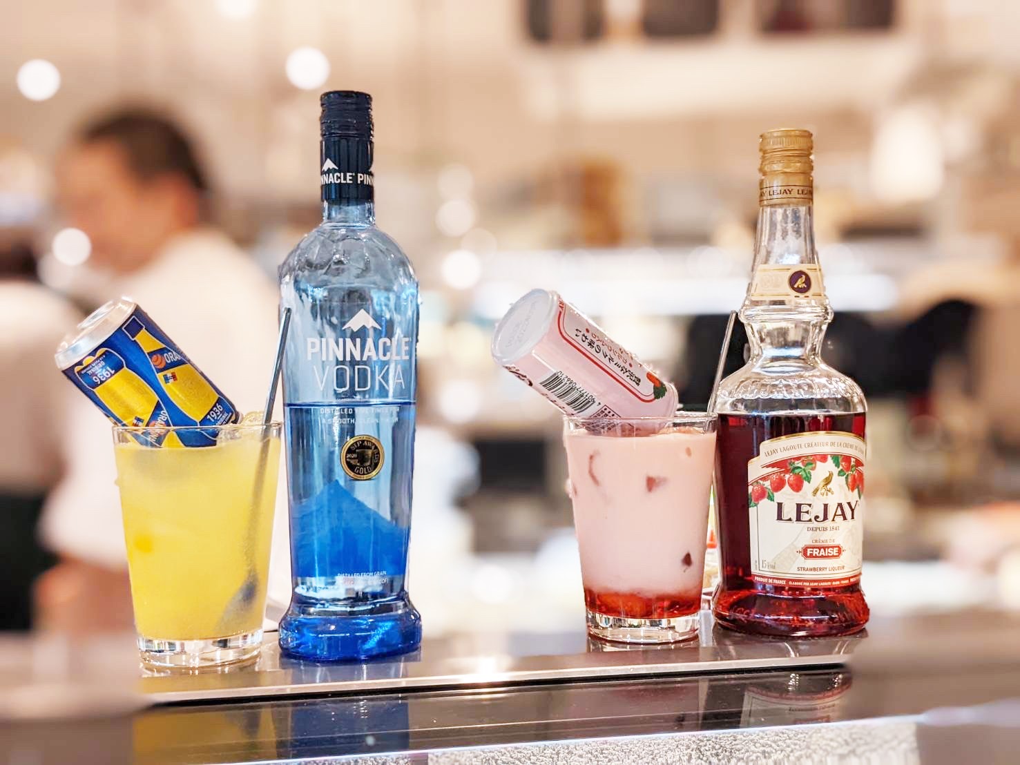 生ビール(605円)、生レモンサワー(418円)、グラスワイン(白・赤、各418円)などスタンダードなものから、ウイスキーを使った「仏男のりんごハイボール」(462円)、ブランデーを使った「仏女のりんごハイボール」(748円)、ウオッカやジンが入ったグラスに逆さまに缶ジュースを差し入れた「バックドロップ式カクテル」(5種、583円~)など変わり種まで約40種類をご用意しております。ビストロ料理に合うワインは、約20種類豊富にそろえました。