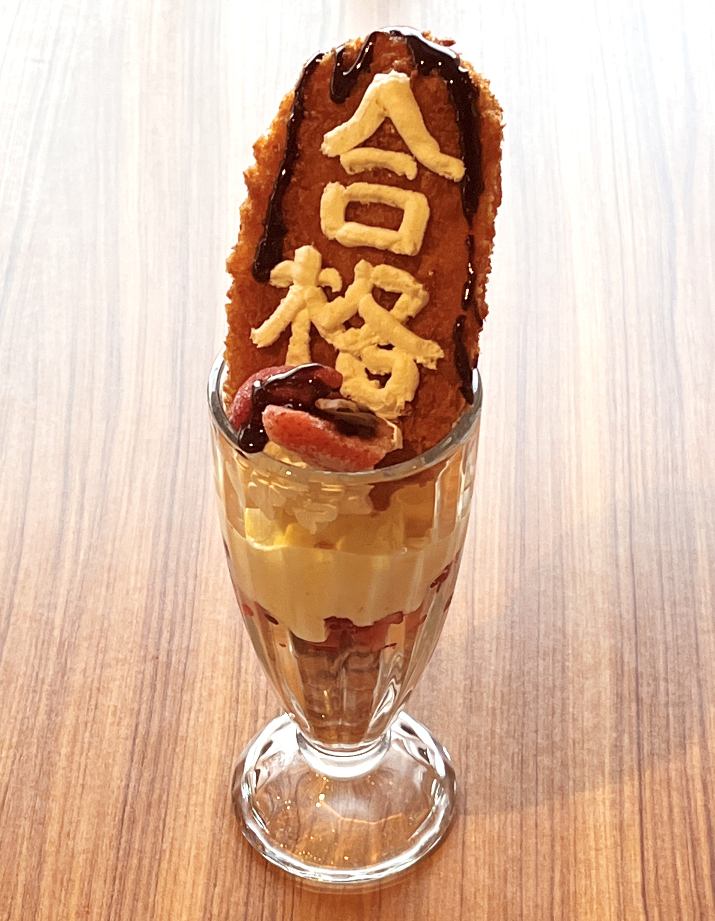 3年ぶりとなる今回は、トンカツをパワーアップし、丸ごと一枚のトンカツをミックスベリーパフェのてっぺんにのせます。絵馬をイメージし、トンカツの表面には生クリームで「合格」と描きチョコソースをかけました。見た目のインパクトだけでなく、ミックスベリーや生クリームを使ったパフェとトンカツという一見驚きの組み合わせながらも味は絶品です。