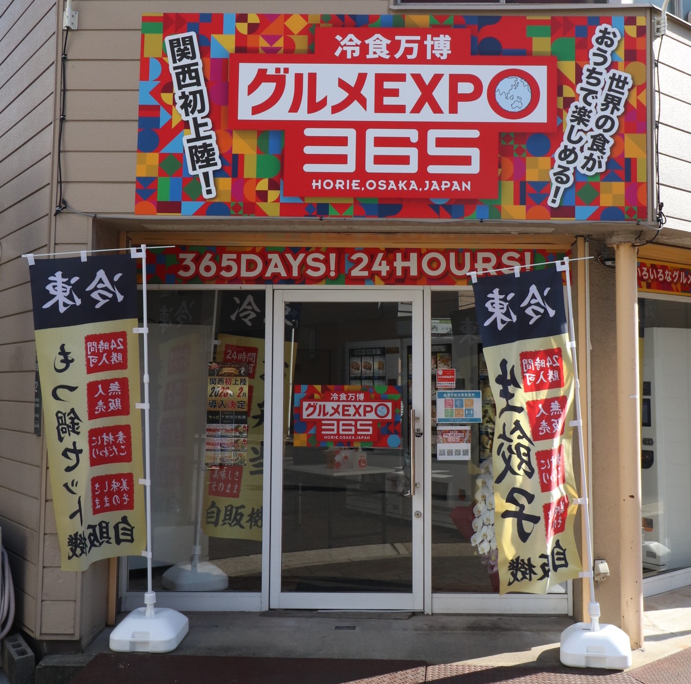 大阪の中心地、梅田や難波から好アクセスの「西長堀」駅から徒歩3分の好立地にあるのは、9台の冷凍自動販売機を構える『冷食万博~グルメ’expo365~』。空きテナントの1階部分を活用した年中無休24時間営業の無人店舗です。自動販売機では全国の餃子を取りそろえた「餃子スターズ」や、通販サイトで人気の高級チョコレート「禁断の割れチョコ」、行列ができる台湾発の小籠包「京鼎樓(ジンディンロウ)」など、関西初上陸の商品や話題のグルメを多数取り扱い、お客様のご来店をお待ちしております。