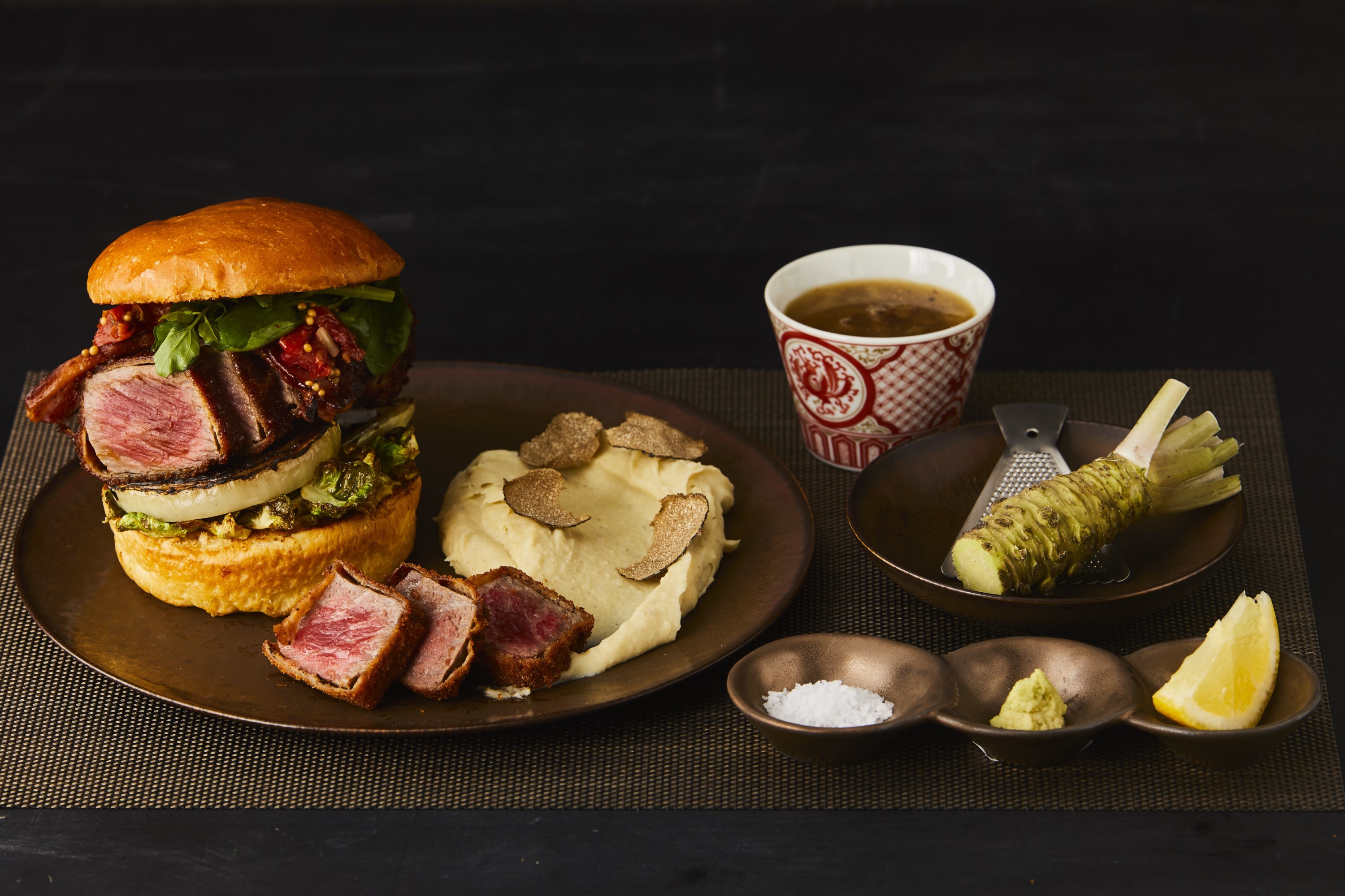 神戸エリア復活を記念して、オープン日の2月11日(土)から2月20日(月)までの期間、「特上 神戸牛カツバーガー -黒トリュフ添え-」を販売します。国産和牛専門店から、このためだけに特別に仕入れたA5ランクの神戸牛リブロース。その中でも、最も美味なる「芯」のみを取り出し、高温でサクッと上げた牛カツは、非常に柔らかくジューシーで、いつまでも舌の上にその甘さと存在感が尾を引く余韻をもち、一度味わうと忘れられない贅沢な一品。最後の仕上げに、高級食材「黒トリュフ」をテーブルでスライスすれば、芳醇な黒トリュフの香りを存分に堪能いただけます。その他、肉を様々に楽しむ別添の赤穂塩・レモン・本わさびをご用意。自身ですり下ろすわさびは、香りがよく、鼻に抜ける爽やかな辛味が特徴。神戸牛ならではの脂の上品な甘さと旨みを最大限に引き出します。豪華な神戸牛カツバーガーは1日3食限定で、公式オンラインショップで事前予約が可能。