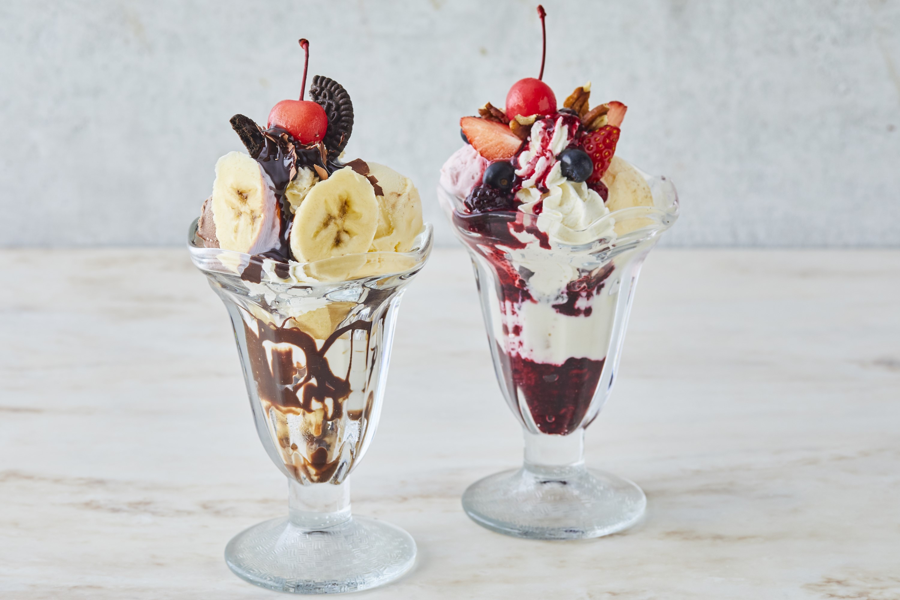 アメリカンダイナーをイメージした可愛らしい見た目のサンデー。フレーバーは、チョコレート&バナナ、ストロベリー&ダークチェリーの2種から選べます。