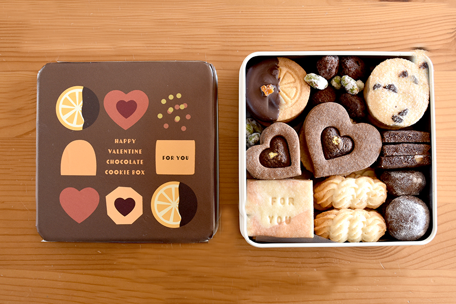 「ハート形のチョコクッキー」「オリーブとレモンのクッキー」「アマンドショコラとピスタチオの砂糖掛け」など味や形の異なるクッキーが9種類。オリジナルプリントのBOX缶にぎっしりと詰込み、バレンタイン仕様のチョコレートカラーで大人っぽい雰囲気に仕上げました。