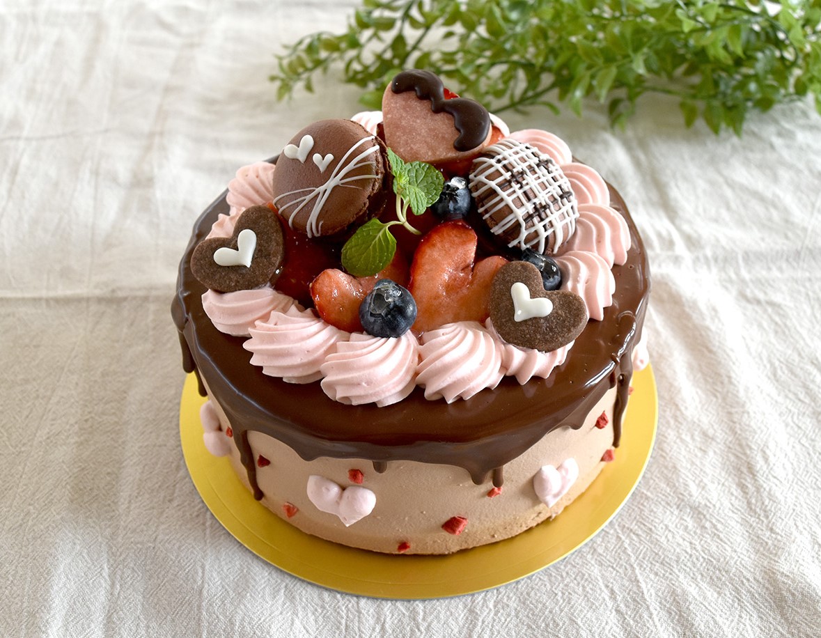 チョコスポンジで苺クリームと苺をサンドし、表面はチョコクリームでコーティング。チョコガナッシュをかけ、マカロンとハートクッキー、苺をのせたとても可愛いらしいケーキです。