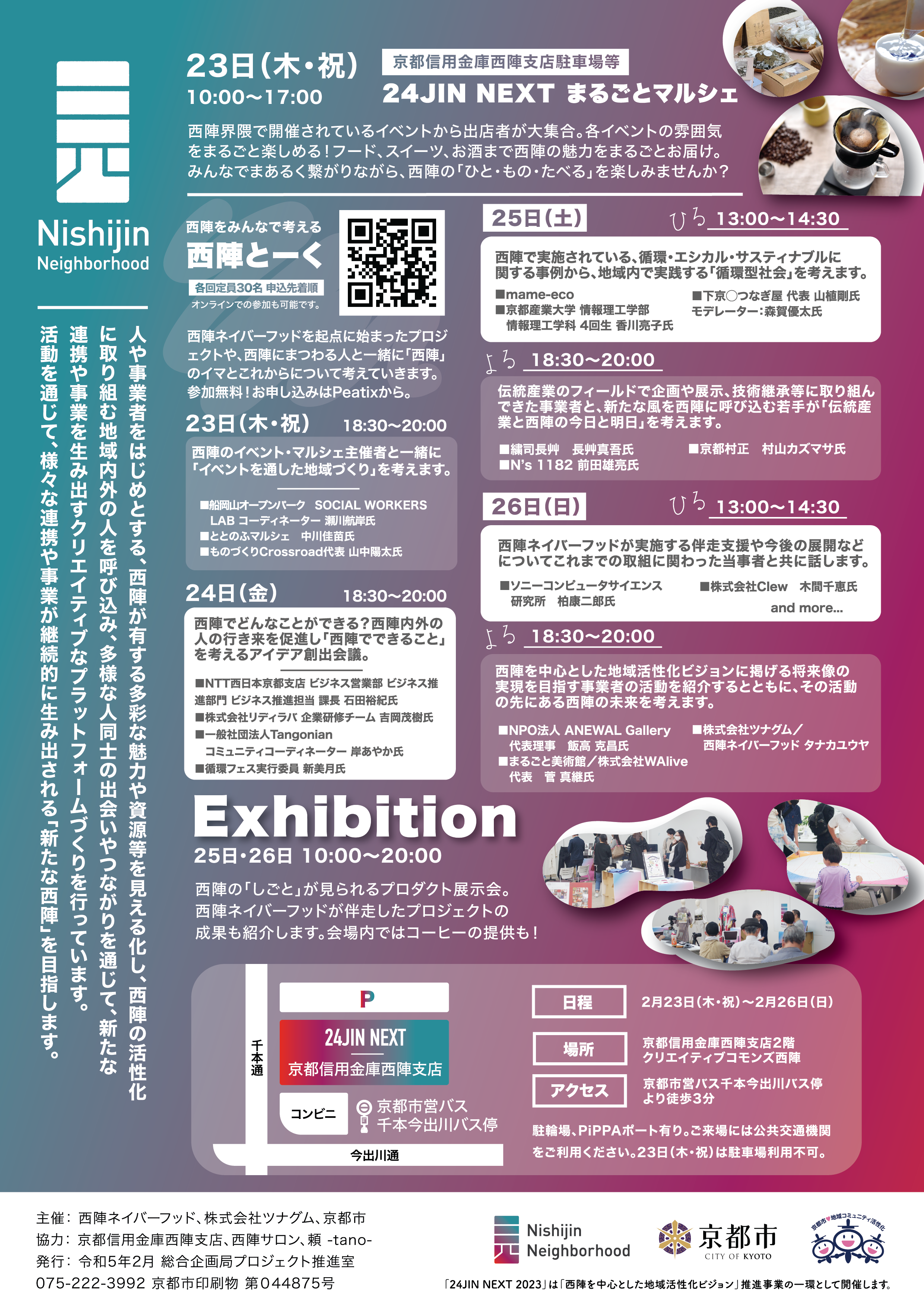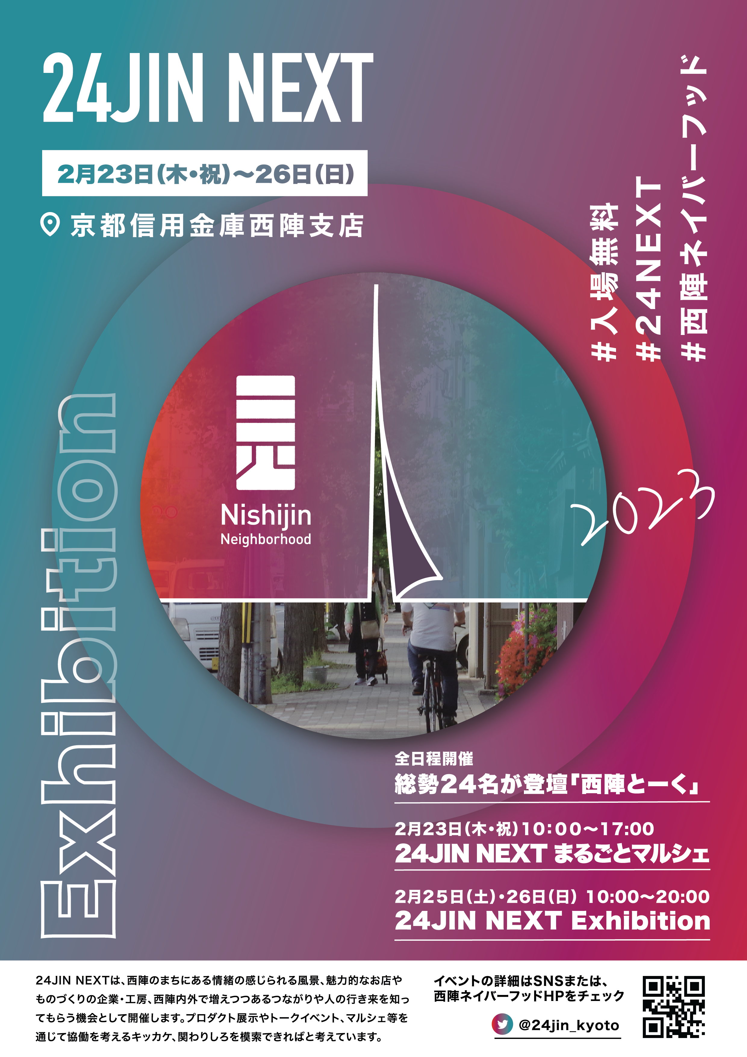 京都市「西陣を中心とした地域活性化ビジョン」活性化プロジェクトの一環である「西陣ネイバーフッド」(代表 タナカユウヤ / 株式会社ツナグム)は、西陣地域の魅力発信の機会として「24JIN NEXT 2023~西(陣・人・ZINE)になる4日間~」を開催する。開催期間は2月23日(木・祝)から26日(日)までの4日間。京都信用金庫西陣支店が会場となり会期中の全てのイベントが入場無料。本イベントは日程ごとにマルシェ、トークイベント、展示など多様なコンテンツを実施。京都、西陣を象徴する伝統産業に注目するだけではなく、地域内企業・食・人など多方面で”西陣”という町を知る機会づくりを担う。