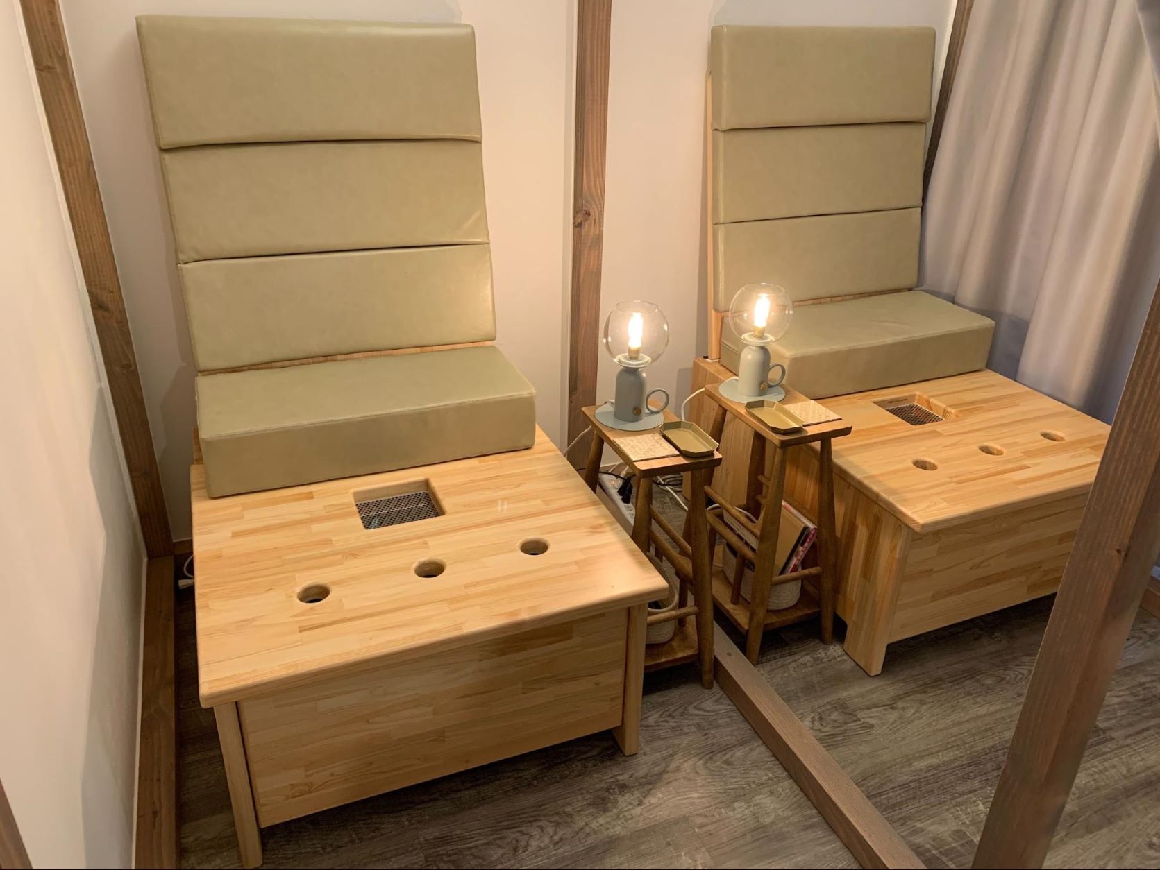 お客様の目や肌に触れるところに温かみを持っていただけるように、日本人にとても馴染みのあるヒノキを使用しております。椅子に使用しているコーティング剤は、公共機関で使われている最高級のものを使用しています。