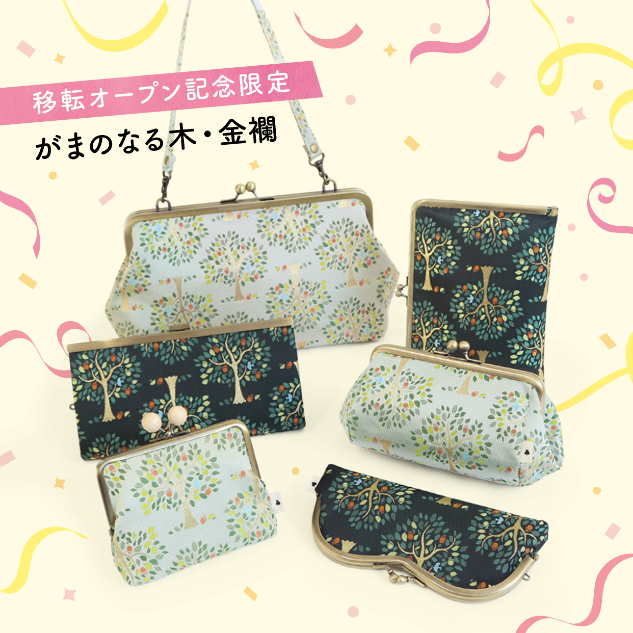 人気の渋谷ヒカリエ ShinQs店限定柄を特別感あふれる上品で華やかな金襴生地で仕上げました。「金のなる木」にちなんで「がま口のなる木」をモチーフにしたオリジナルテキスタイルで、幸せの青い鳥も描かれた縁起の良いデザインです。白緑(びゃくろく)・黒の2色展開。