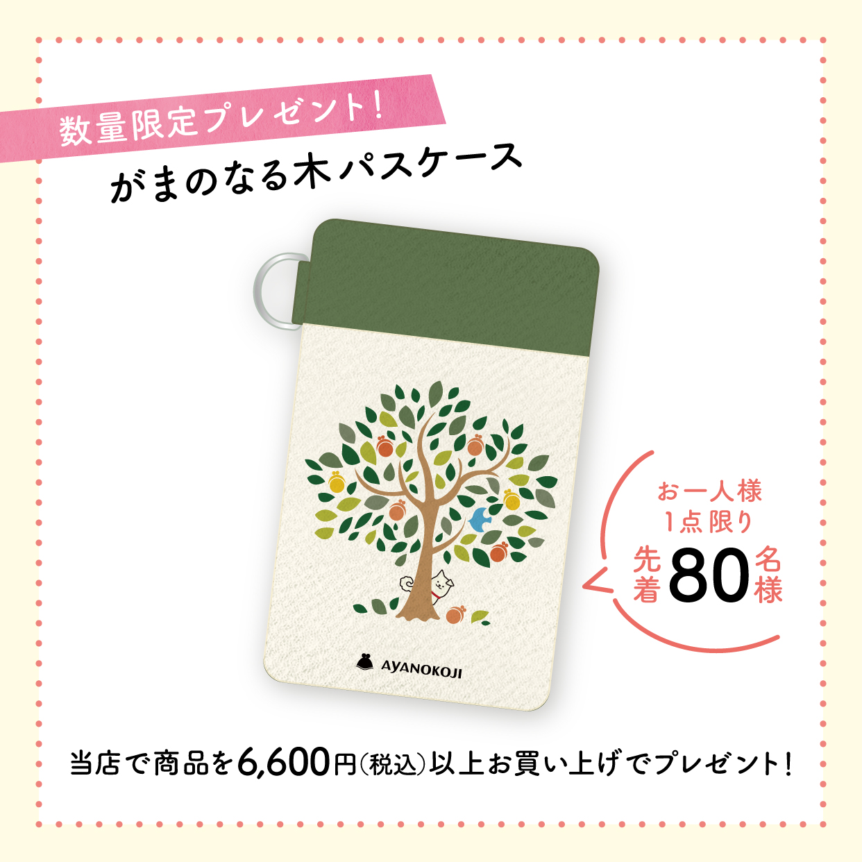 2023年3月10日(金)より、商品を6,600 円(税込)以上お買い上げのお客様に、がまのなる木からハチ公がのぞいているオリジナルプリントを施したパスケースを1点プレゼントいたします。