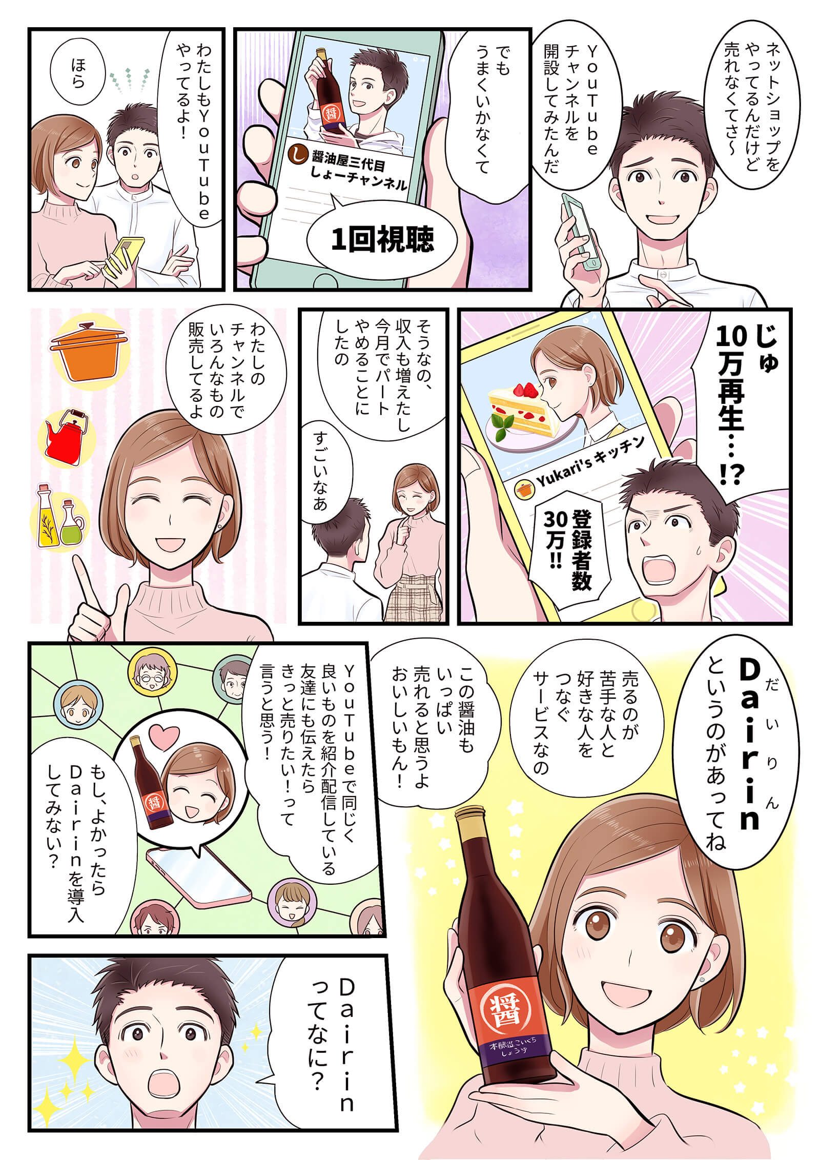 反対に、ユーチューバーやインスタグラマーが主導し、愛用している商品の販売主に「商品を紹介させて欲しい」と働きかけ、Dairinを導入することもあります。