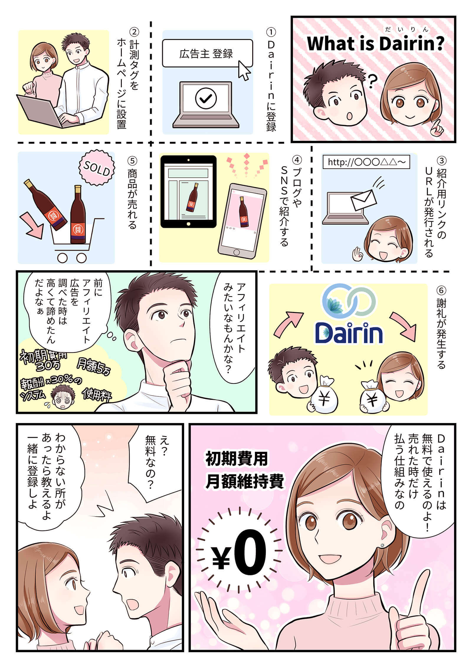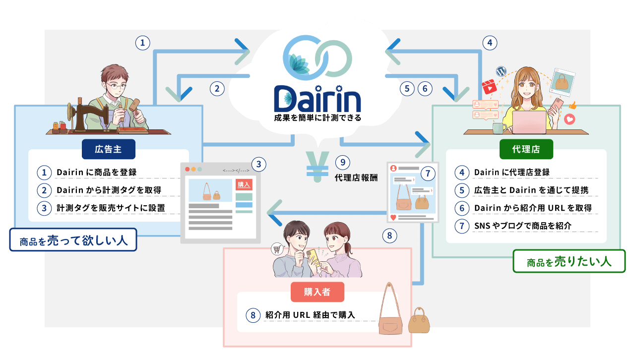 そこでDairinが誕生しました。「売るのが苦手」「時間を捻出できない」「既存広告は投資対効果が見合わない」といった課題を持つ生産者が広告主となり、自社サイトにDairinが発行する計測タグを設置します。一方で「好きなことをストレスなく発信し、それを仕事にしたい」人が代理店となり、生産者に代わってこだわりや思いを発信し、Dairinが発行する紹介用リンクを用いて紹介をします。