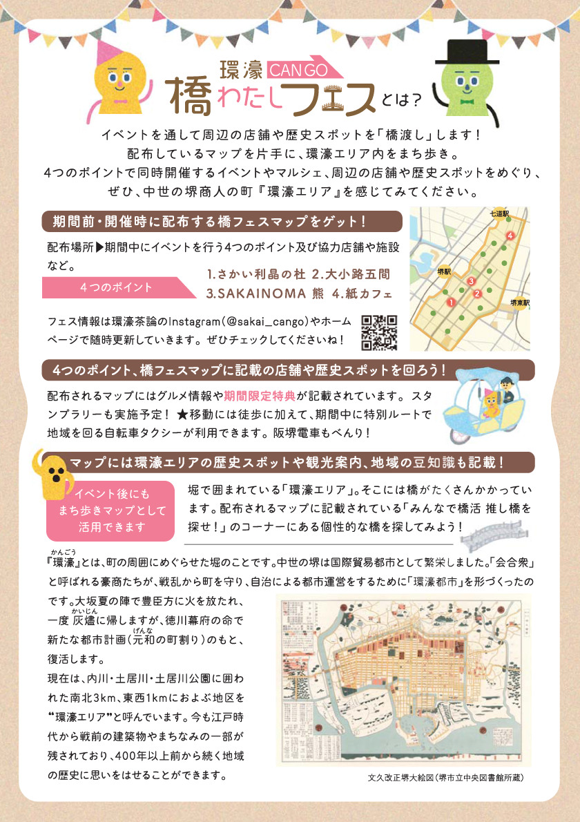 4つのポイントで同時開催するイベントやマルシェ、周辺の店舗や施設、歴史スポットをめぐり、ぜひ、中世の堺商人の町『環濠エリア』を感じてみてください。
