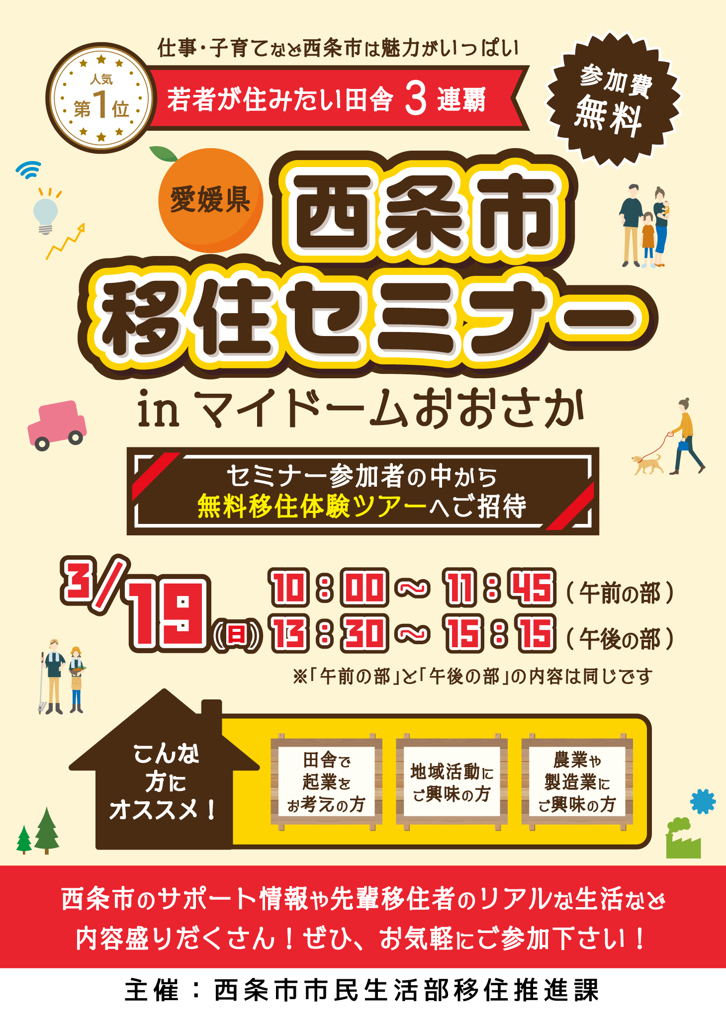 仕事や子育てなど魅力がいっぱいの西条市の特徴やサポート情報、先輩移住者のリアルな生活についてなど内容盛りだくさんの移住セミナーです。