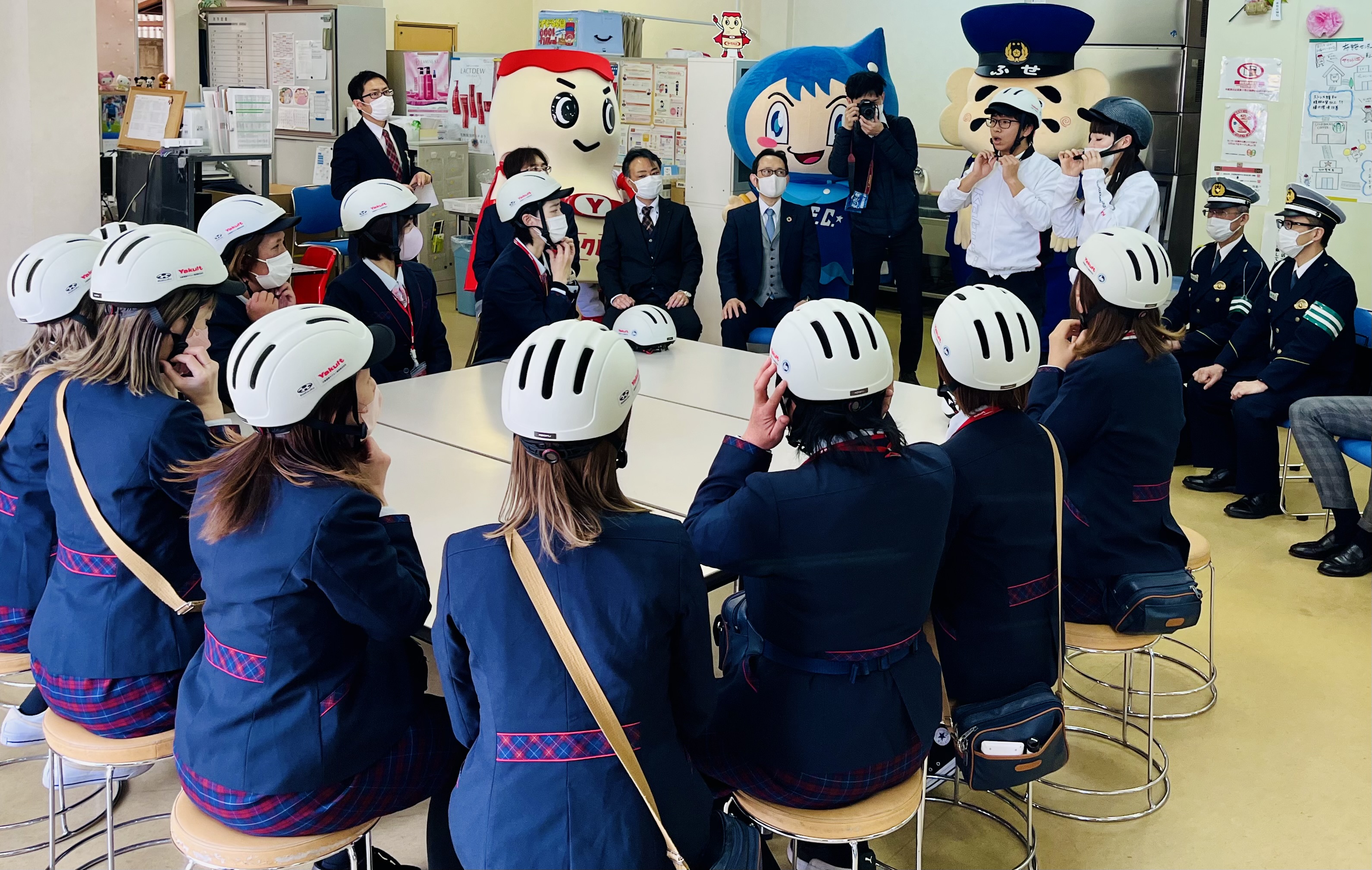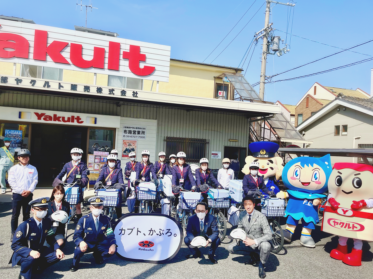 出陣式には、所轄の布施警察署、布施警察署マスコットキャラクター「ふせまるくん」、FC大阪のクラブマスコットキャラクター「えふしくん」とヤクルト公式キャラクター「ヤクルトマン」も駆け付けてくれました。今後、3社は協力して、自転車の安全利用とヘルメット着用に関する啓発活動に努めてまいります。