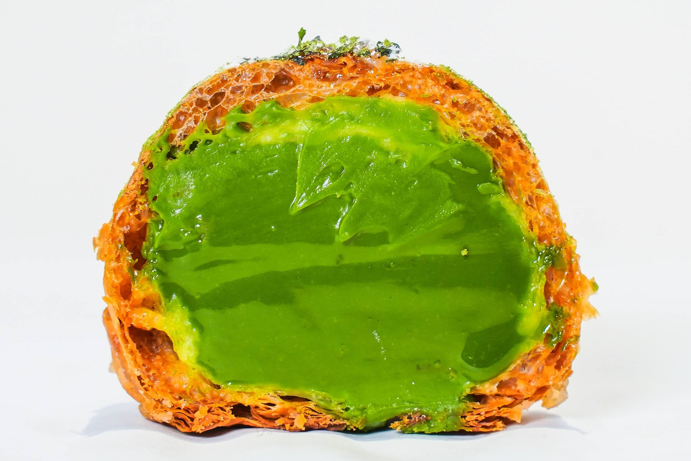 茶源郷と呼ばれる京都南部で栽培され、800年の歴史を持つ抹茶を使った濃厚な抹茶クリーム。抹茶にする前の香り高い茶葉を飾りに。