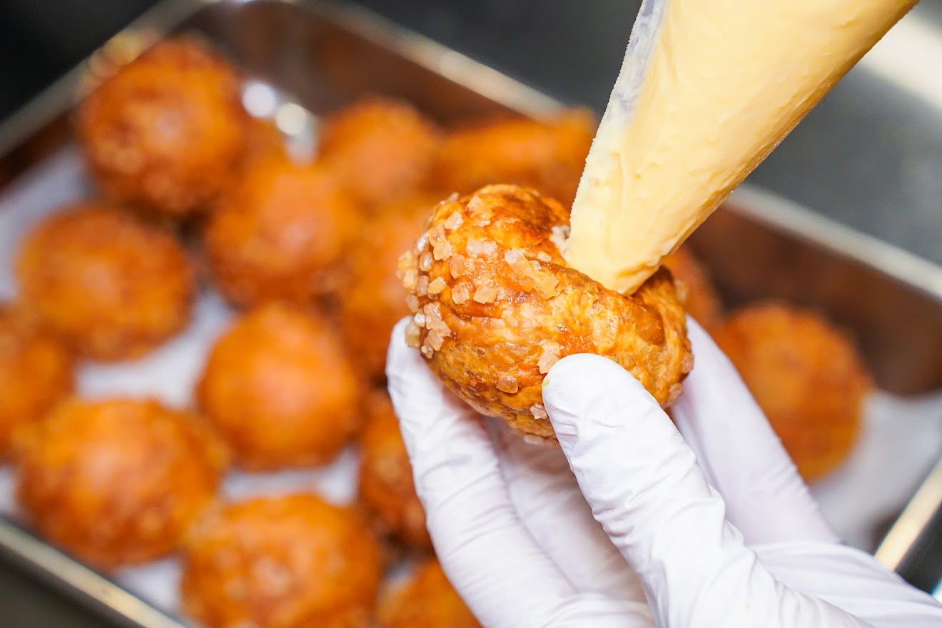 厳選した牛乳、北海道産バター、吉備の平飼い卵、高級砂糖の和三盆糖を使った上品な甘さの王道のシュークリーム。