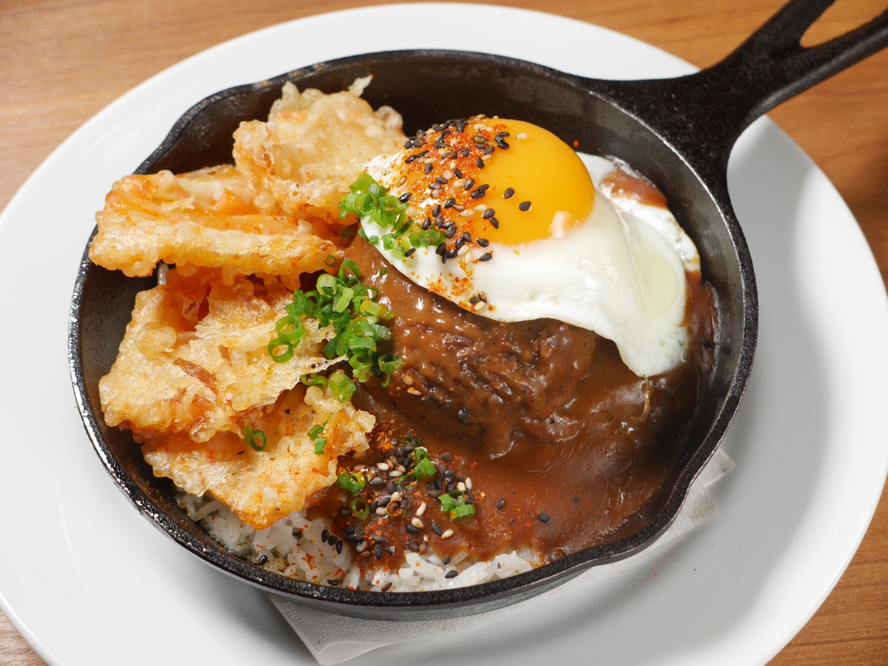 ハワイアンフード「ロコモコ」にキムチの天ぷらのトッピングしたオリジナルメニュー。ご飯はガーリックライスを使用。