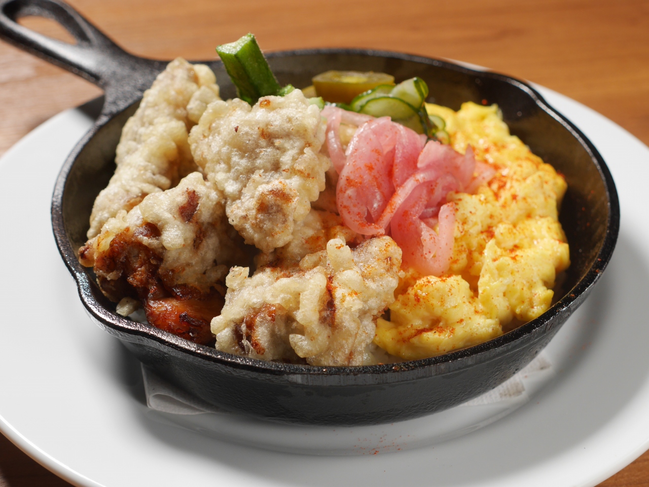 フライドチキンにフランス風スクランブルエッグ、自家製ピクルスを添えて。