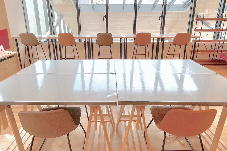 当施設は今年2月に移転した本社2階(兼事務所)にあり、1階は紙の倉庫となっています。地元の人、近くを立ち寄った人が気軽に入れるよう1階には緑を添え、2階も中が見やすいようガラス張りに。カフェのような空間を目指しました。