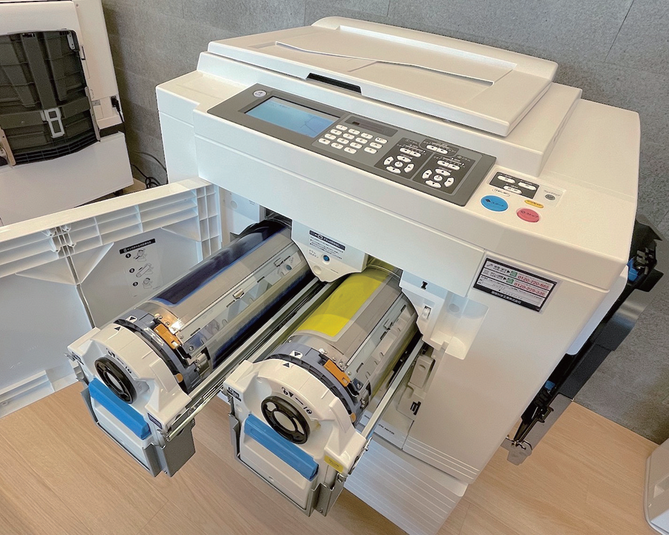 リソグラフとは孔版印刷方式(スクリーン状の版に微細な孔(あな)を開け、そこからインクを用紙に押し出す技法)の高速デジタル印刷機です。