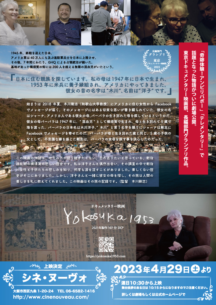 2022年11月5日より、全国公開をしてきました、和歌山大学観光学部教授、木川剛志が監督をつとめたドキュメンタリー映画『Yokosuka1953』が4月29日より大阪市西区九条の「シネ・ヌーヴォ」にて劇場公開を行う運びとなりました。学術研究から映画上映に至るという新しい学術の形の成果発表となります。本上映の情報掲載及び取材等、ご支援ご協力をいただけますよう、何卒、よろしくお願い申し上げます。舞台挨拶の取材もよろしくお願いします。
