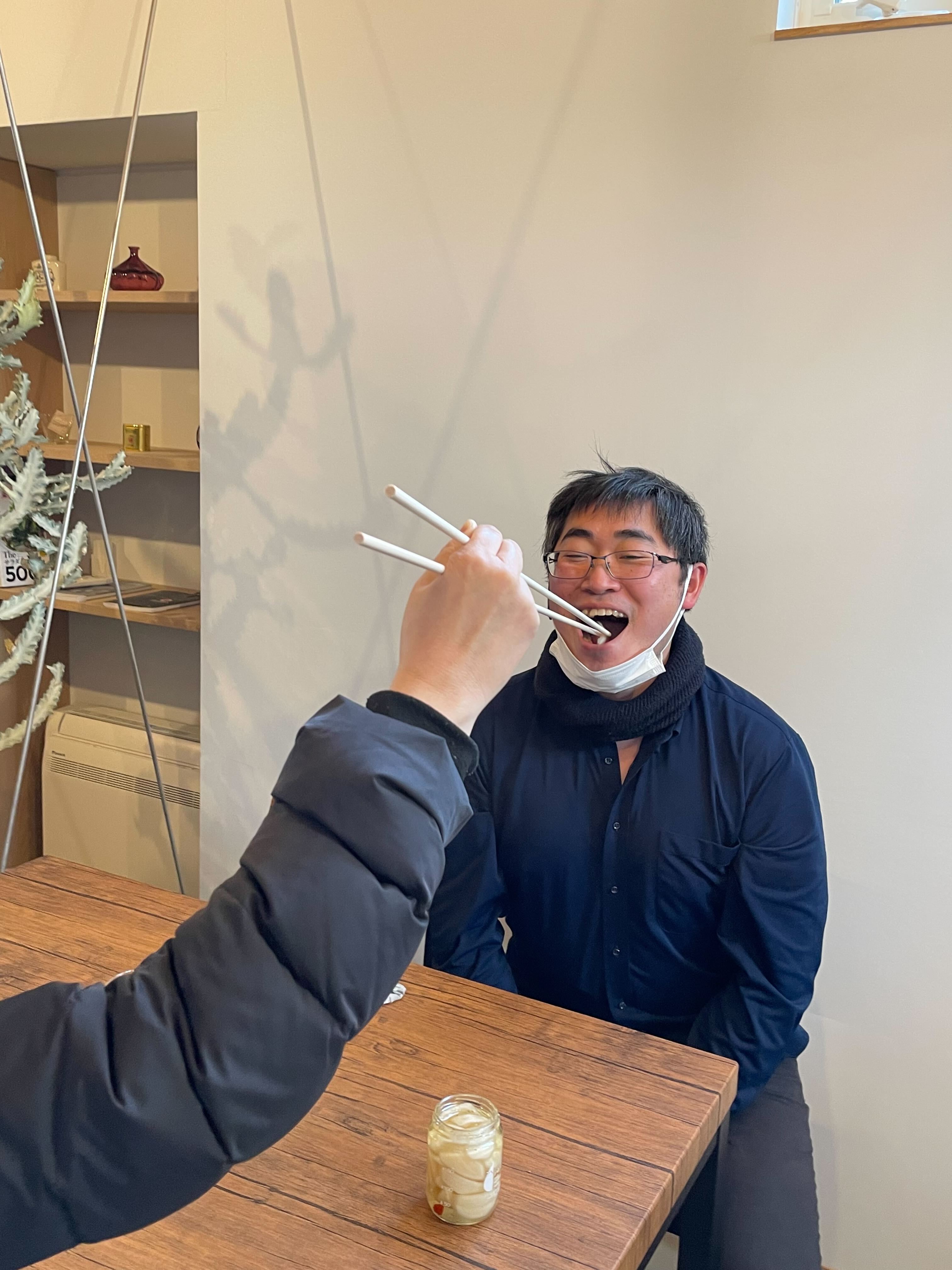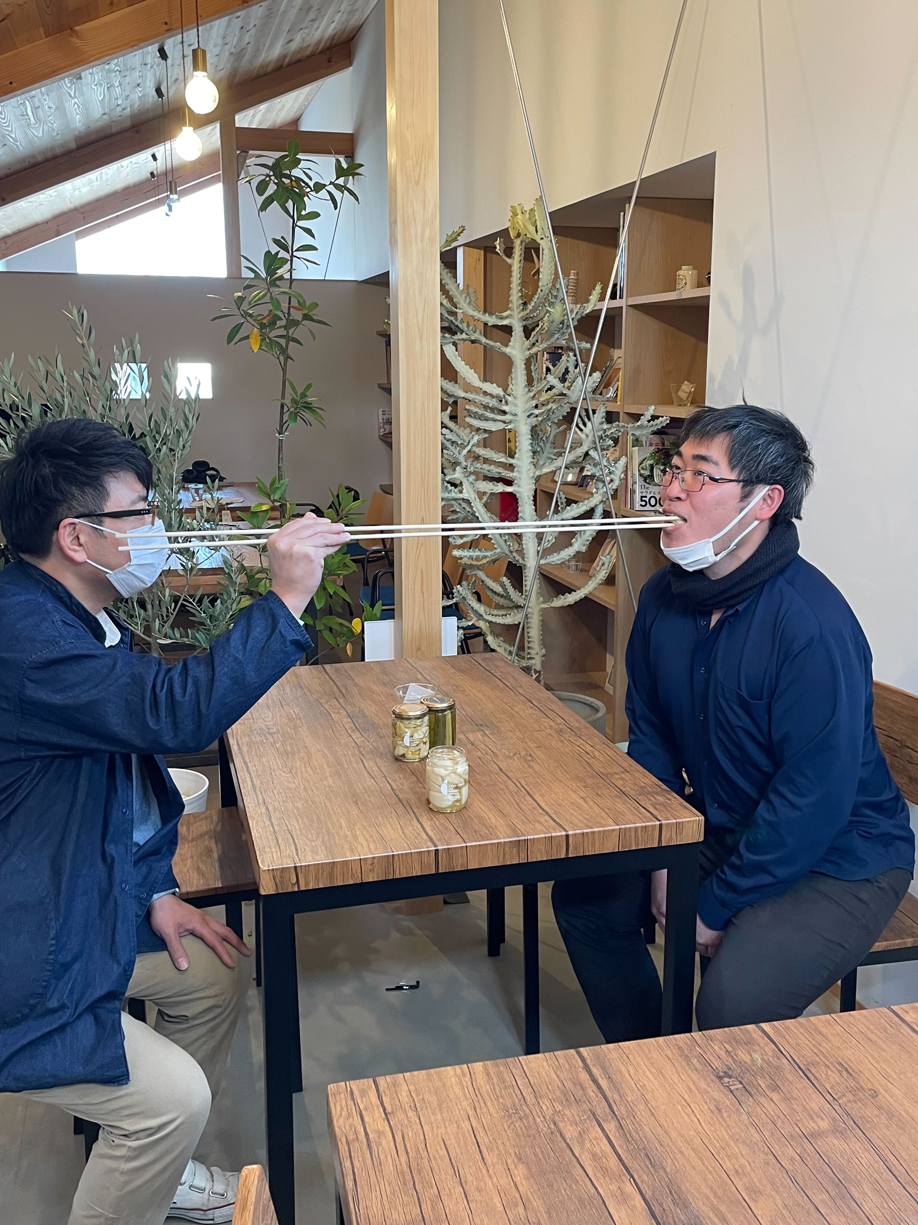 極楽のピクルスは名前の通り、昔話にある極楽の世界を今現在に実現させた企画です。極楽のピクルスは200円で提供する試食のピクルスセットで、3尺3寸(=99.99㎝)箸を使って食べてもらいます。自分で食べようとしても、箸が長すぎて自分の口には運べません。これが地獄の様相です。SON CAFEは「親が子にするように、誰かを思いやる」がコンセプトの飲食店です。極楽ではお互いに食事を食べさせ合います。SON CAFEらしさを追求し、極楽の世界観でサービスを提供したい。そういう想いから極楽のピクルスが誕生しました。