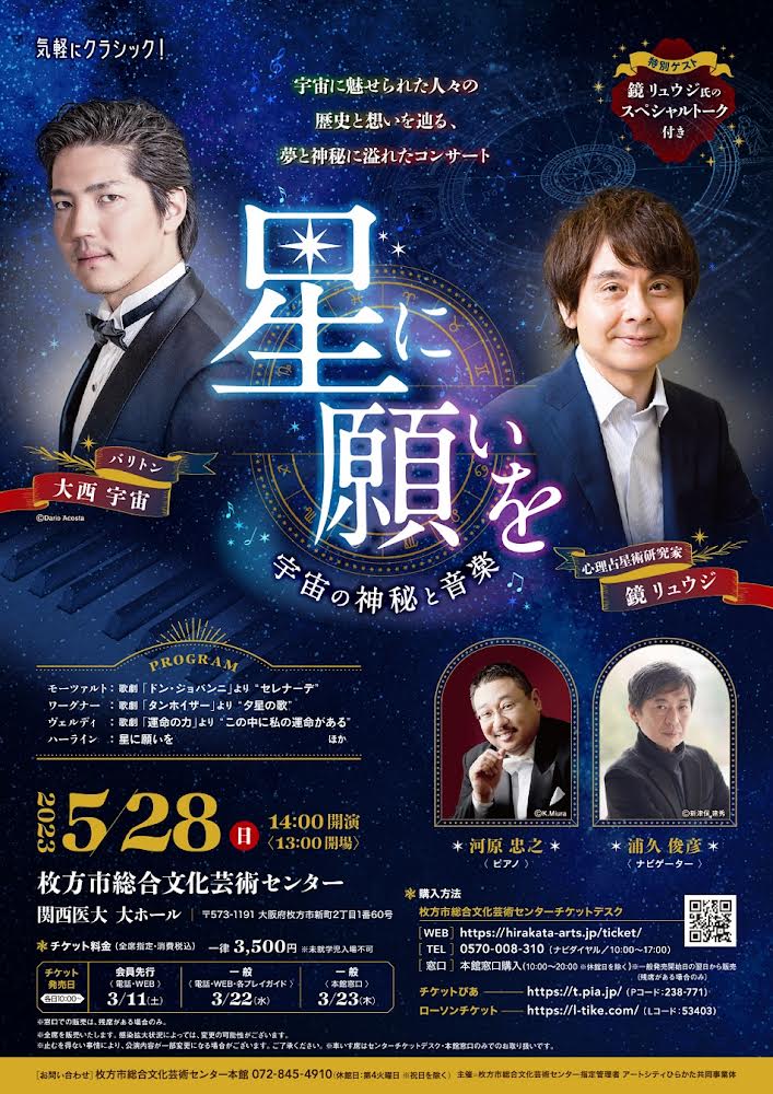 占星術の第一人者、鏡リュウジ氏が出演する本公演では、ホロスコープを使って作曲家や出演者の人間性などを紐解きます。作曲家や出演者の知られざる一面を知り、改めて音楽を聴くと感慨深いものがあります。また、占星術という思想の根底と音楽のつながりを解説いただきます。今を時めくバリトン歌手、大西宇宙さんの素敵な歌声を聴き、星や宇宙に思いを寄せることができる、【星のまち 枚方】にとっておきのトーク&コンサートです。