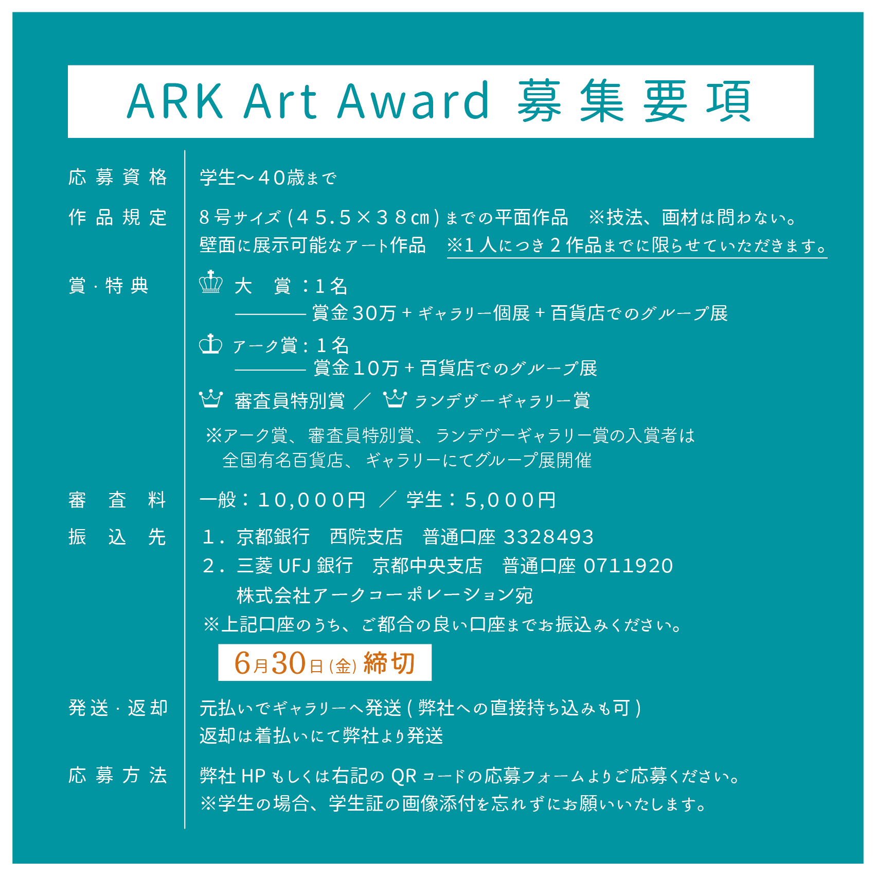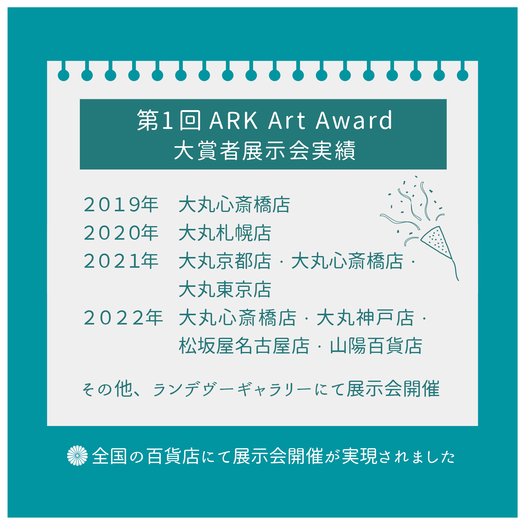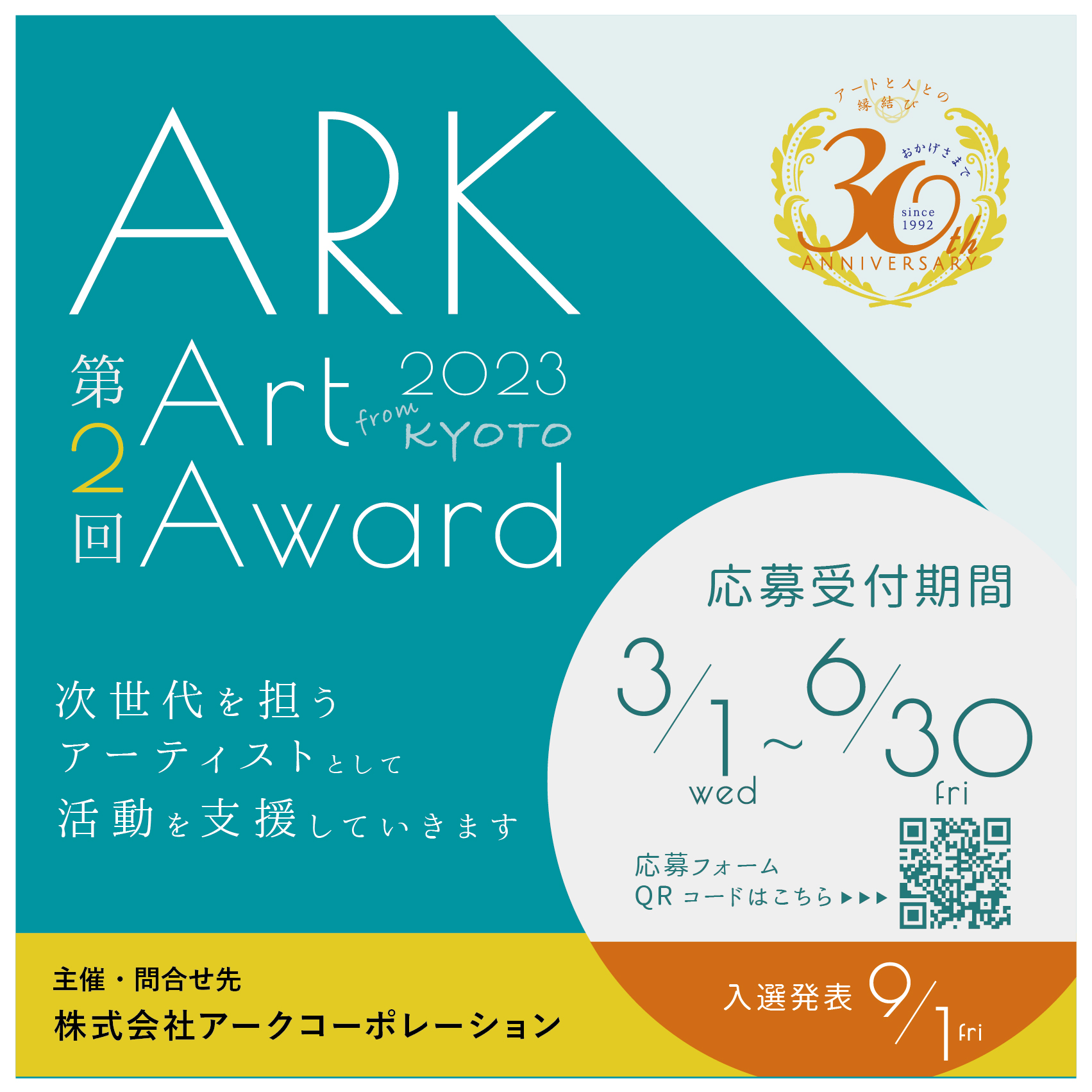 5年ぶりの開催となるARK Art Award。本公募展は、若い才能を見出し、育成することを目的としています。受賞者は、全国百貨店・美術画廊での展示会開催など、アーティストの作品を発表する場を設け、活動を支援していきます。