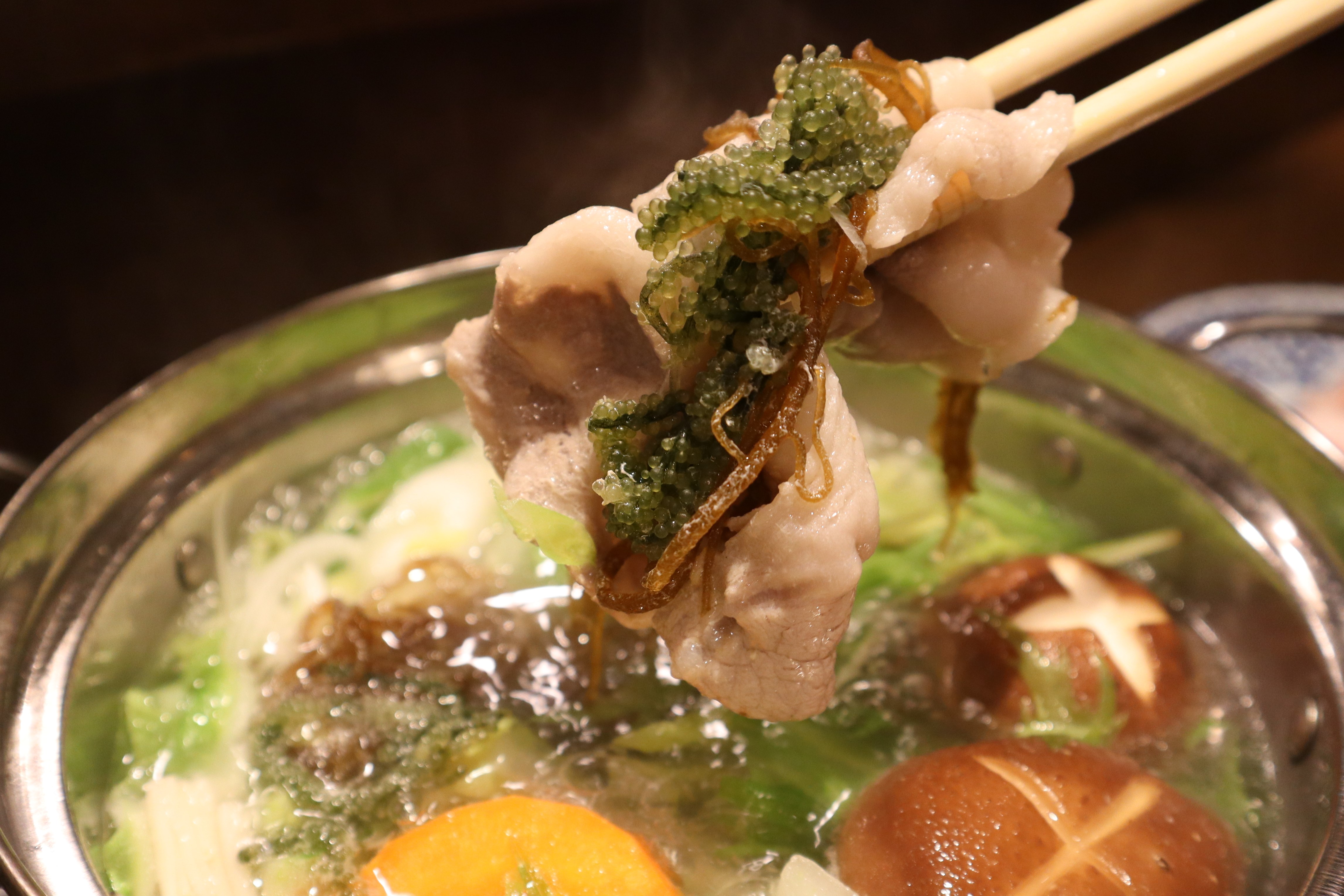 当店では昼、夜ともに松竹梅3種のコースをご用意。松(昼=4,180円、夜=7,980円)では純血のアグー豚「あぐ~島黒(しまくる~)」を、竹(昼=3,480円、夜=6,380円)では75%の「やんばる島豚あぐー」を、梅(昼=1,880円、夜=3,480円)ではパイナップルの飼料を食べて育った「パイナップルポークあぐー」を提供します。野菜はにんじん、白菜、豆腐など基本的なものに加え、沖縄から仕入れた海ぶどうやもずくをご用意。さっとしゃぶしゃぶした豚に巻いてプチプチとした食感をお楽しみください。(ライス、野菜、海ぶどう、もずくはおかわり自由)。つけダレは「ポン酢」「ごま」のほか、「塩ポン酢」「わさび出汁」の4種をご用意。焼肉・焼鳥業態で15年修業した料理長が、その知見を生かして開発しました。おすすめはわさび出汁で、わさびのツンとした辛味が、アグー豚の甘みを引き立てます。お肉は一人あたり180~200gとボリュームがあるものの、脂にクセが少なくスッキリとした後味が特徴。「焼肉がしんどくなってきたけど、ガッツリお肉を食べたい!」というお肉好きの願望を叶えられるお店です。デザートで提供するバニラアイスは、風味の強いニューカレドニア産のバニラビーンズと、北海道産ジャージー牛乳を使用。濃厚でバニラの風味豊かなアイスに仕上げています。