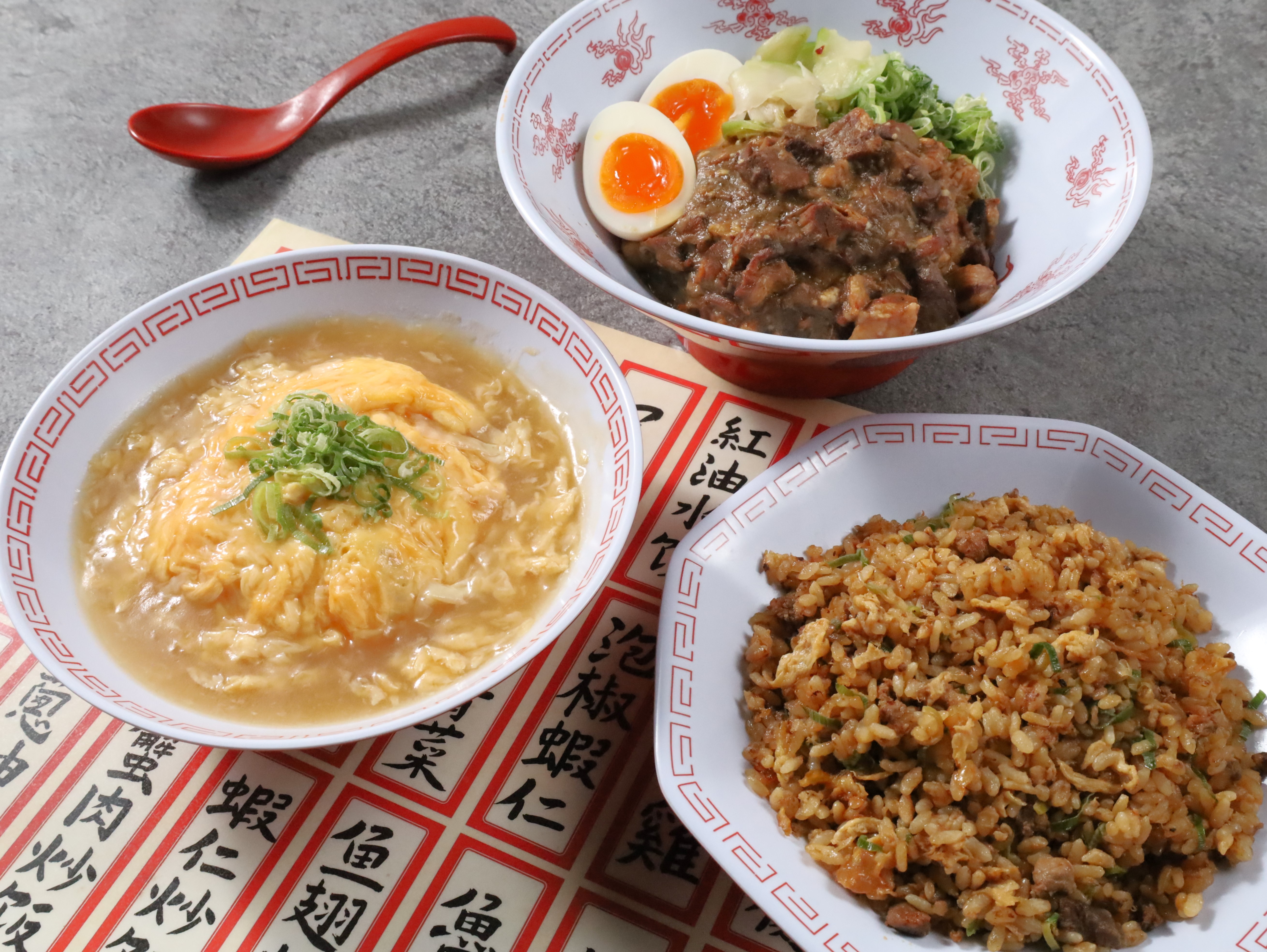 ふわふわ玉子の天津飯、「白」と「黒」の2種類ある担々麺など豊富にラインナップ。