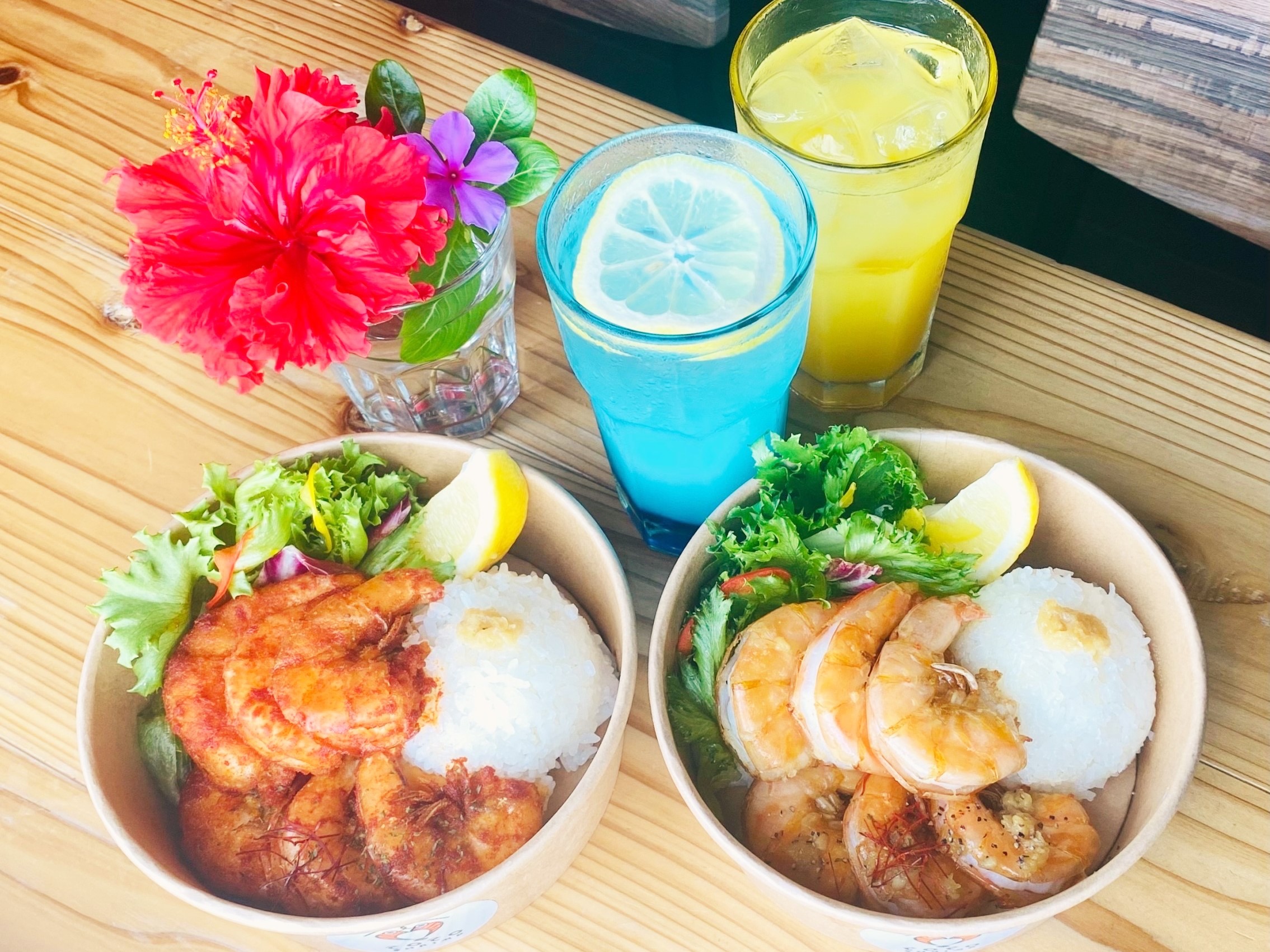 看板メニューのガーリックシュリンプは、大手ホテルで料理長を務めたフレンチシェフが監修したソースを使用。ガーリックがたっぷり入った「ガーリックシュリンプ」とピリ辛フレーバーが癖になる「ガーリックシュリンプスパイシー」(ともに、ライス・サラダ付き)の2種類をご用意。ココナッツオイルで揚げた大ぶりのエビは、殻ごと食べれるほど柔らかく、ぷりぷりとした食感です。
