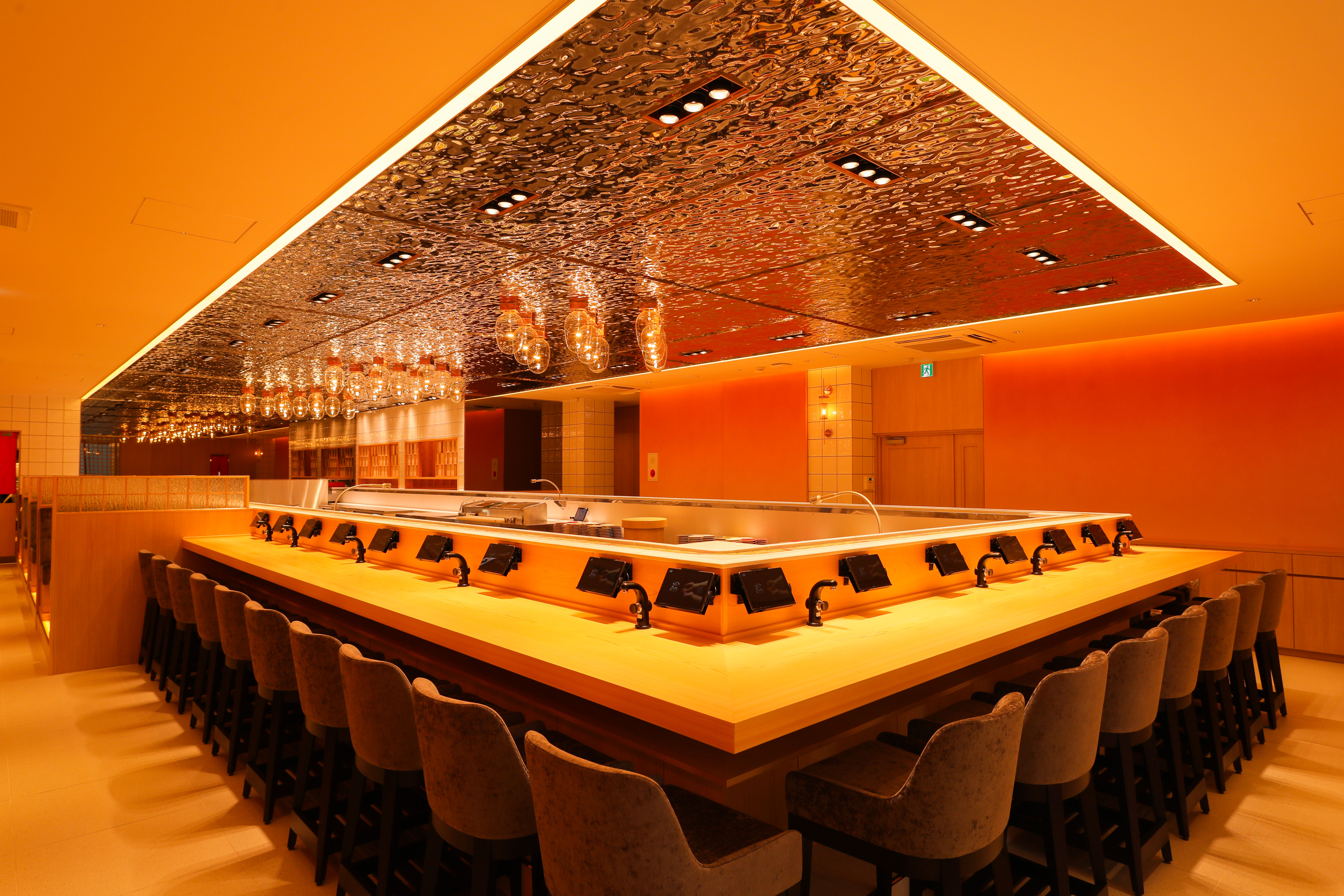 京都ならではの奥に広い店内には、その特性を活かした⾧さ 12 メートルの大きな桧のカウンターが中央に配置され、上部には糸のように繊細な金属のレイヤーを用いたシェードと伝統的な釘隠しの装飾が美しい照明を兼ねたオブジェが象徴的に連なります。壁面と天井には、名栗と呼ばれる木を荒く削り落とす伝統手法を用いた木材がはめ込まれた真鍮のルーバーが連続し、その煌びやかな装飾たちを暖かな間接照明の光が包み込みます。店内の床や壁面には、400年の伝統を持つ淡路の瓦を用いた磁気質タイルが敷かれ、天然の素材が持つ独特な”いぶし"の質感が凛とした空間を演出しています。