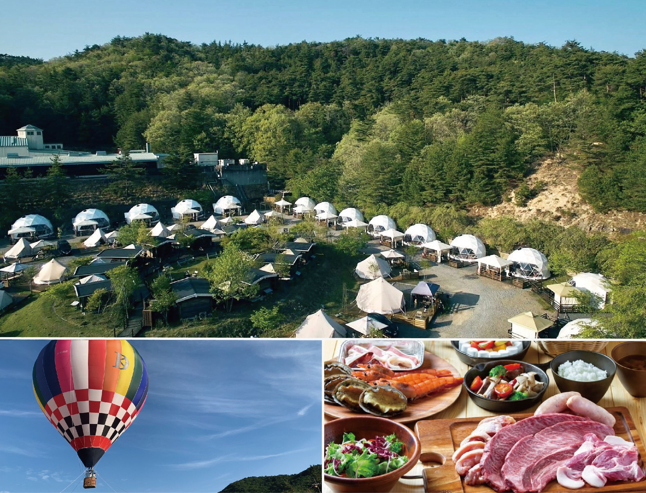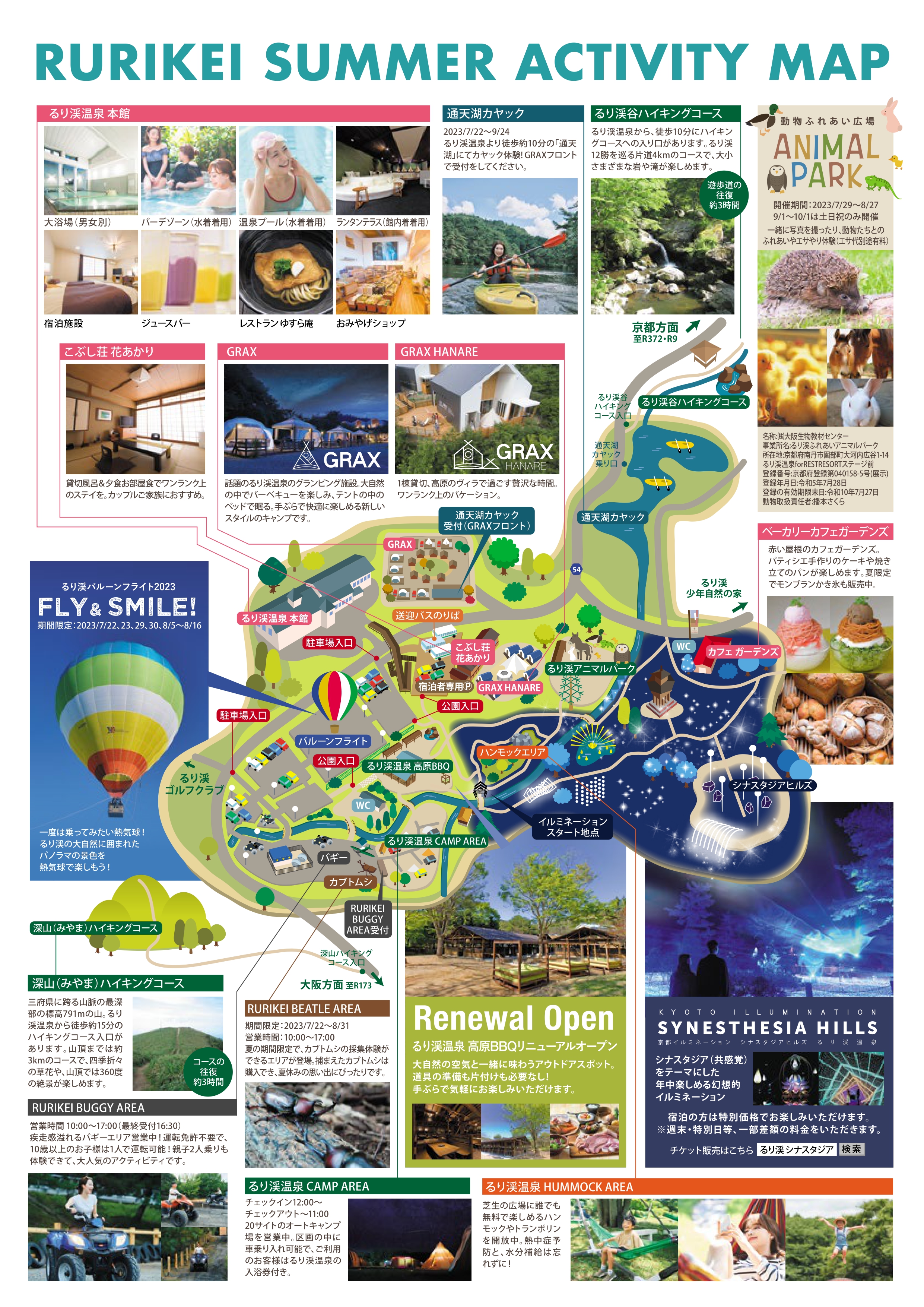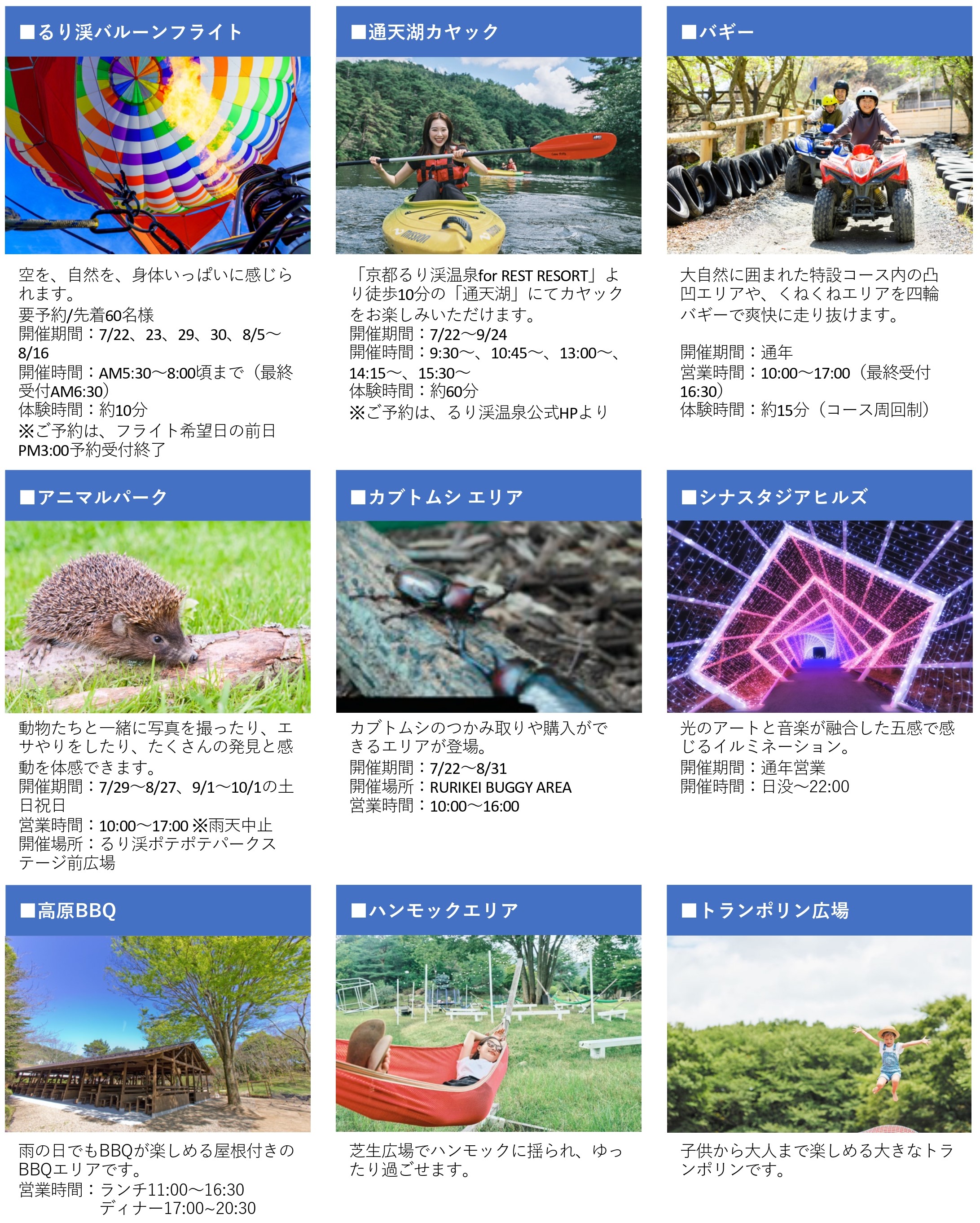 お子さまから大人まで三世代ファミリーでお楽しみいただける高原スパリゾート「京都るり渓温泉 for REST RESORT 」には、今年も大自然の中で特別な体験ができるさまざまなアクティビティがあります。毎年大好評のバルーンフライトは、空気の澄み切った早朝に飛び立ち、地上約30メートルの空中散歩。敷地内のエリアを爽快に疾走するバギーや通天湖でのカヤックなど、夏ならではのアソビが満載です。他にも、イルミネーション「シナスタジアヒルズ」や温泉、プール、ランタンテラスと、るり渓温泉ならではの充実した1日をお楽しみいただける多彩なスポットや癒しのコンテンツがあり、思いっきり遊びたい方も、ゆっくりと癒されたい方も、各々のスタイルで愉しめます。今年の4月にリニューアルした高原BBQでは、地元食材やドリンクをご用意しておりますので、飲んで、食べて、遊んで、夏の暑さも時間も忘れる充実した1日をお過ごしいただけます。