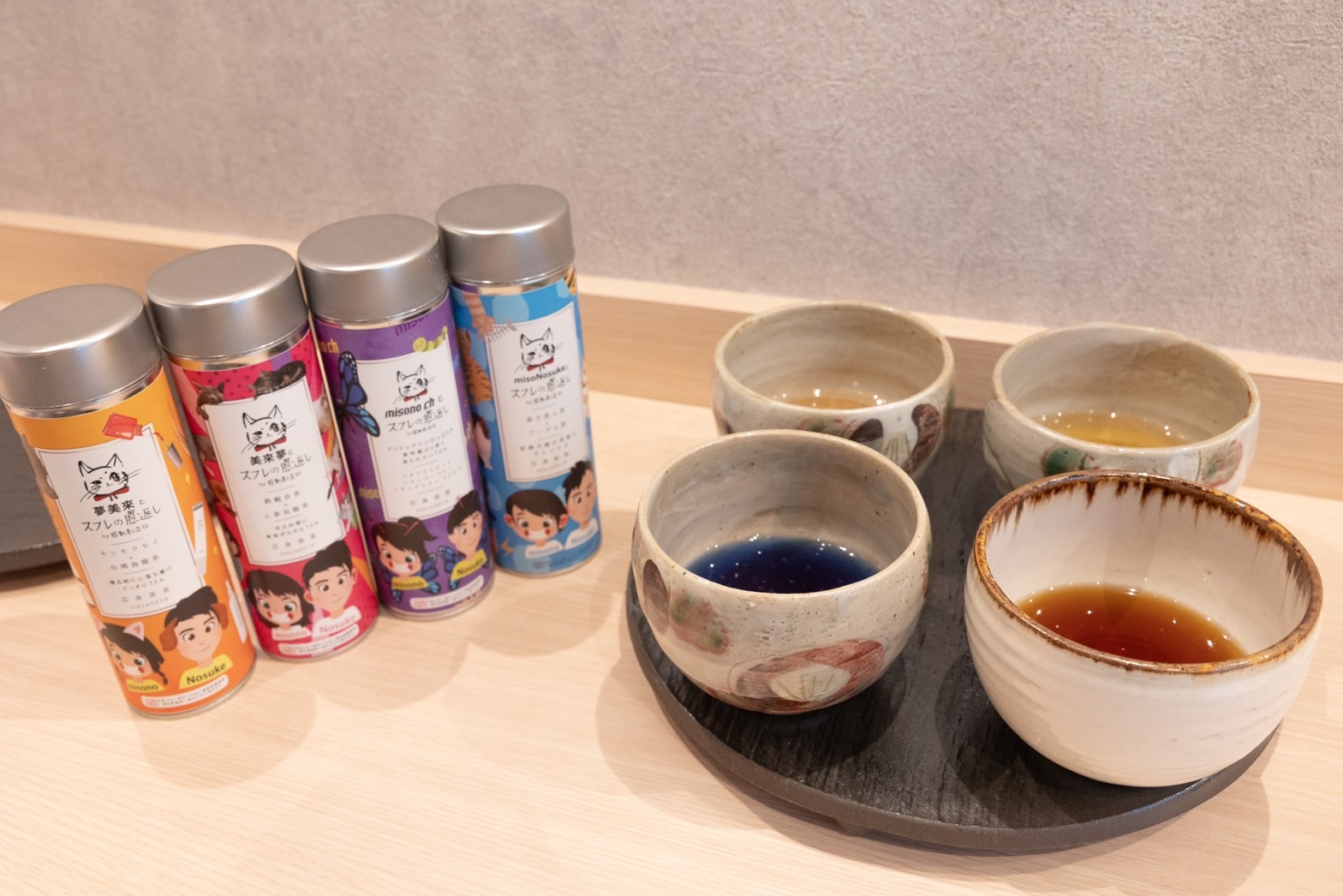 抹茶・ほうじ茶・コーヒー・タレントのmisono さんプロデュースのお茶『未來夢とスフレの恩返し』4 種をご用意しております。