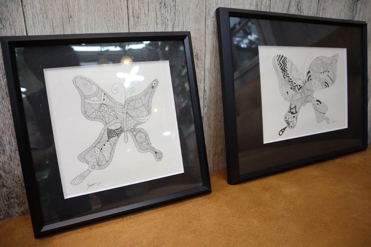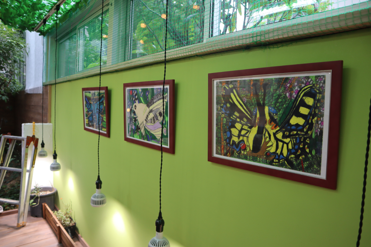 当店最大の特徴は、店内の一画に設けた年中温室のテラス。蝶の飼育(羽化成功率は自然界の約130倍※)に加え、子どもたちの昆虫観察の場、学校の課外授業などの利用を想定しています。集めた蝶はナミアゲハなど馴染みのあるものから、オオゴマダラなどレアなものまで約10種、最大300頭がギャラリー内を飛び交い、蝶が目の前で羽化する、あるいは手に止まるなど自然界ではほとんど見られない場面に立ち合えます。ゆくゆくは蛹(さなぎ)の飼育キットの販売も企画中です。カフェではコーヒーやスイーツなどを販売予定で、蝶の羽ばたく様子をガラス越しに見ながらお過ごしいただけます。さらに社会貢献活動の一環として、障がいのある方が描いた蝶のアート作品を展示・販売(ECサイトでも展開)。売上は全額作者に還元し、障がいをお持ちの方の社会参加や情報発信を応援します。