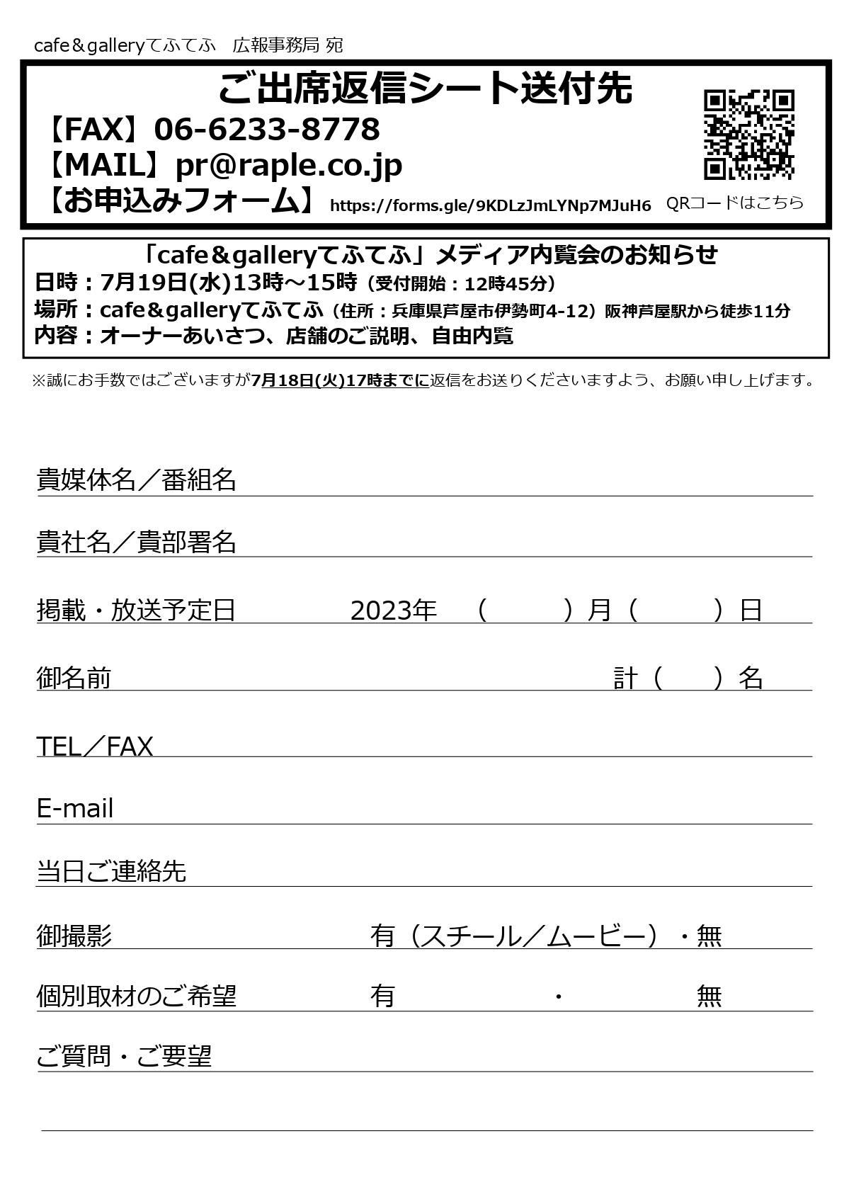 cafe&galleryてふてふ 広報事務局 担当:辻本・田村