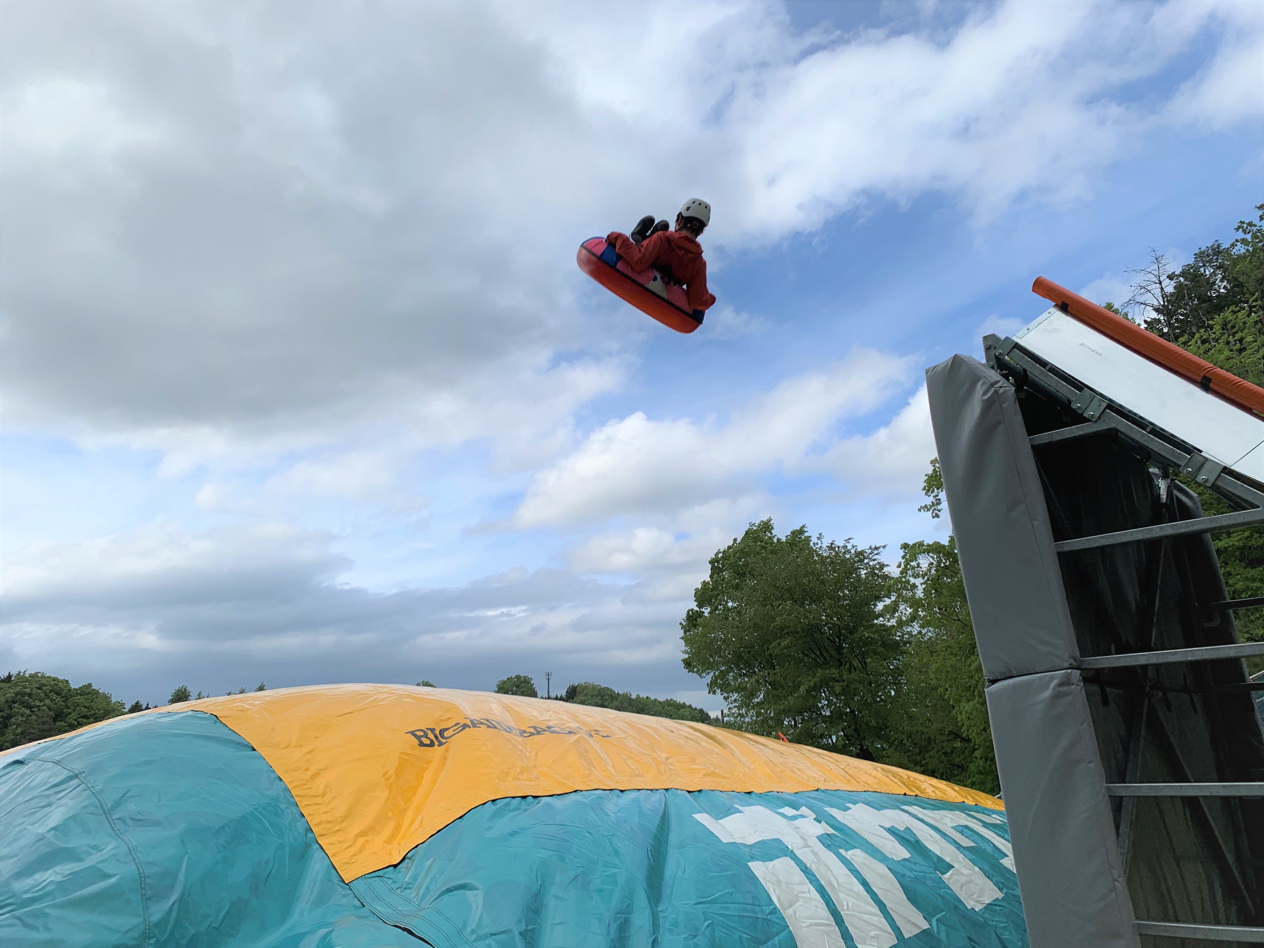 「メイハンダイブ」はTubby Jumpとして親しまれているオランダ発祥の遊具です。大阪と名古屋をつなぐ主要幹線道路「名阪国道」に隣接していることから当店ではその名をつけました。山の斜面を生かし、12mと7.7mの高さのレーンを設置し、そこから浮き輪で滑り降りて最後はジャンプする西日本初(※当社調べ)のアトラクションです。グランドオープンの時期が夏休みに近く、ファミリー層の利用増が考えられることから、期間限定で「問題付き」にチェンジ。滑空中に下で待機しているスタッフが簡単な算数の問題を出します。正解すると、喉の渇きを癒すスポーツドリンクをプレゼント。簡易テント内にスポットクーラーを設置し、冷えっ冷えの空間で飲んでいただけます。汗だくの中で飲むキンキンに冷えたドリンクは格別です。小学生以外も挑戦可能ですが、大人の場合は問題が難しくなります。頑張って正解して、お子さまに「カッコいいお父さん、お母さん」を見せてあげてください。