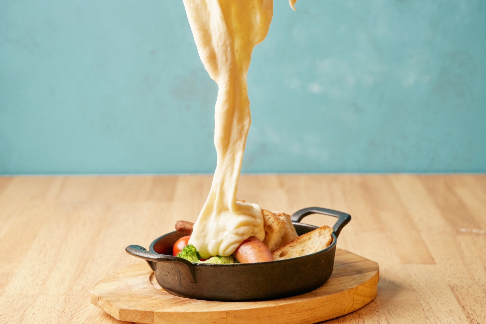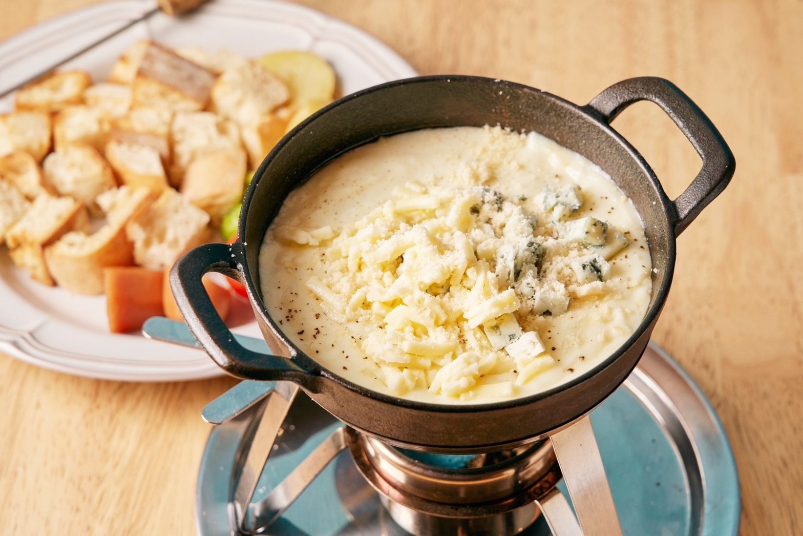 チーズは、フランスやイタリアなど世界各国から滋賀県竜王市の湖華舞(こかぶ)牧場直送の生産量が少ない貴重な国産チーズまで10種類以上をそろえています。1店舗月1000個販売する看板メニューで、生地を切るとチーズが流れ出る「シカゴピザ」(4種、1,749円~)や 、マッシュポテトにチーズやニンニクを混ぜたアリゴを野菜やバゲットにかける「日本一チーズがのび~るアリゴ」 (1,210円) 、チーズの種類を選べる「チーズフォンデュ」(2種、1,540円~) など創作チーズ料理のほか、系列店の肉屋直送の新鮮な肉を使った「黒毛和牛赤身のステーキ」(2,310円)、「淡路麺業」の生パスタを使い、贅沢にブッラータチーズ1個をトッピングした「国産生ブッラータとボロネーゼパスタ」(1,980円)など約60種類のメニューをご用意しています。