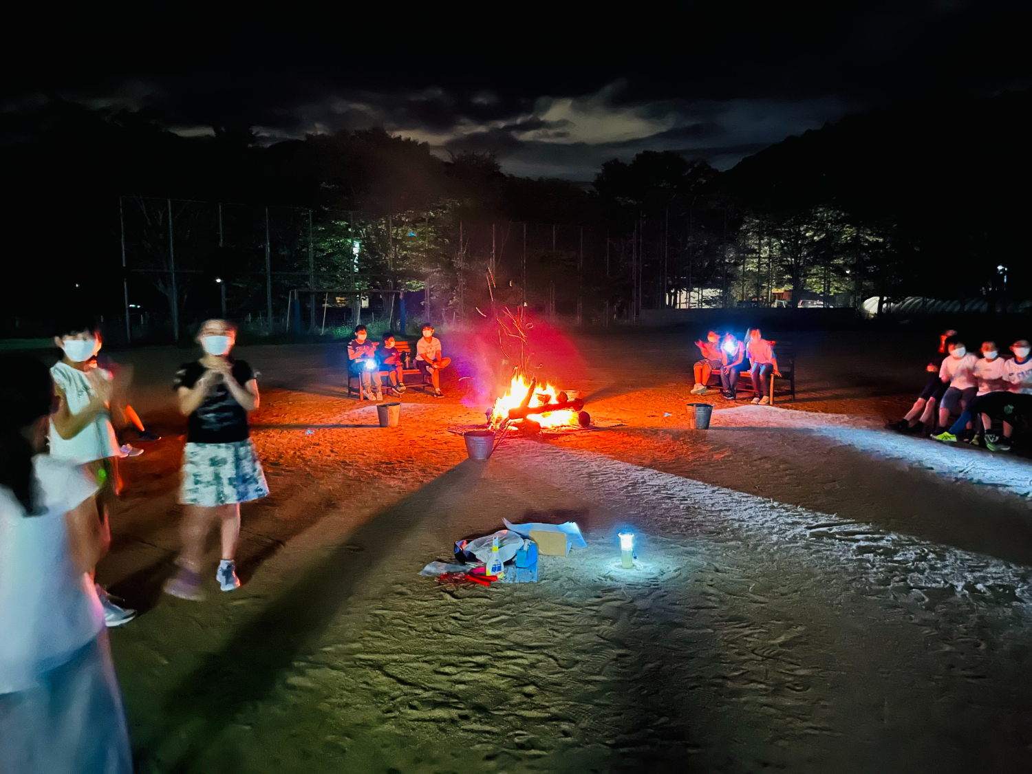 1日目:和菓子作り体験、水鉄砲大会、ソフトクリーム型ペンライト製作、理科の爆発実験、キャンプファイヤー